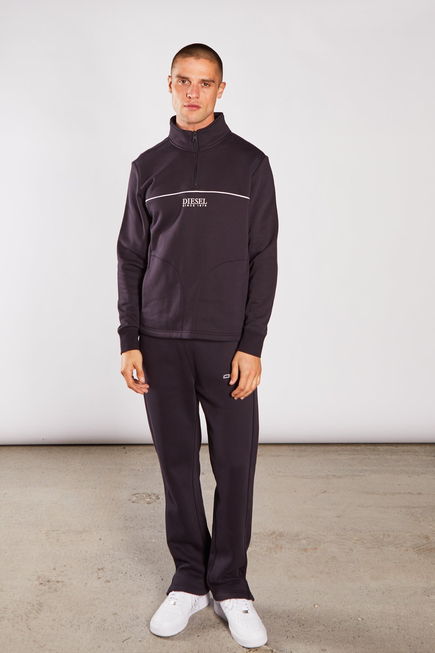 A super soft sweat fleece half-zip funnel neck with a DIESEL raised rubber print on the chest & contrast piping across the chest. Featuring front pockets & straight hem. Team it with one of our Classic Track t-shirts & jogger for a complete Classic Track look.