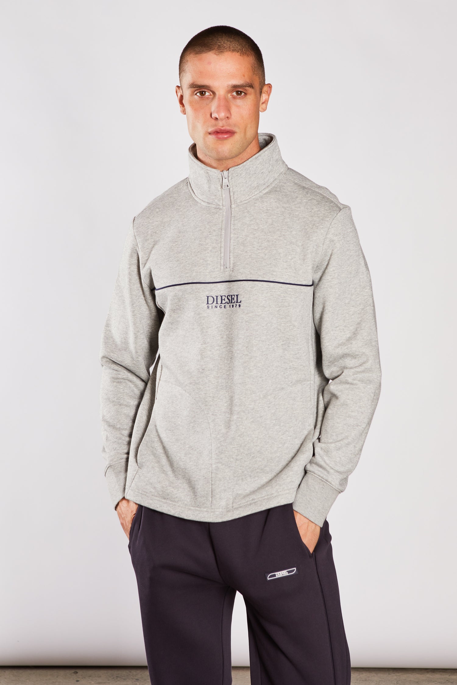 A super soft sweat fleece half-zip funnel neck with a DIESEL raised rubber print on the chest & contrast piping across the chest. Featuring front pockets & straight hem. Team it with one of our Classic Track t-shirts & jogger for a complete Classic Track look.