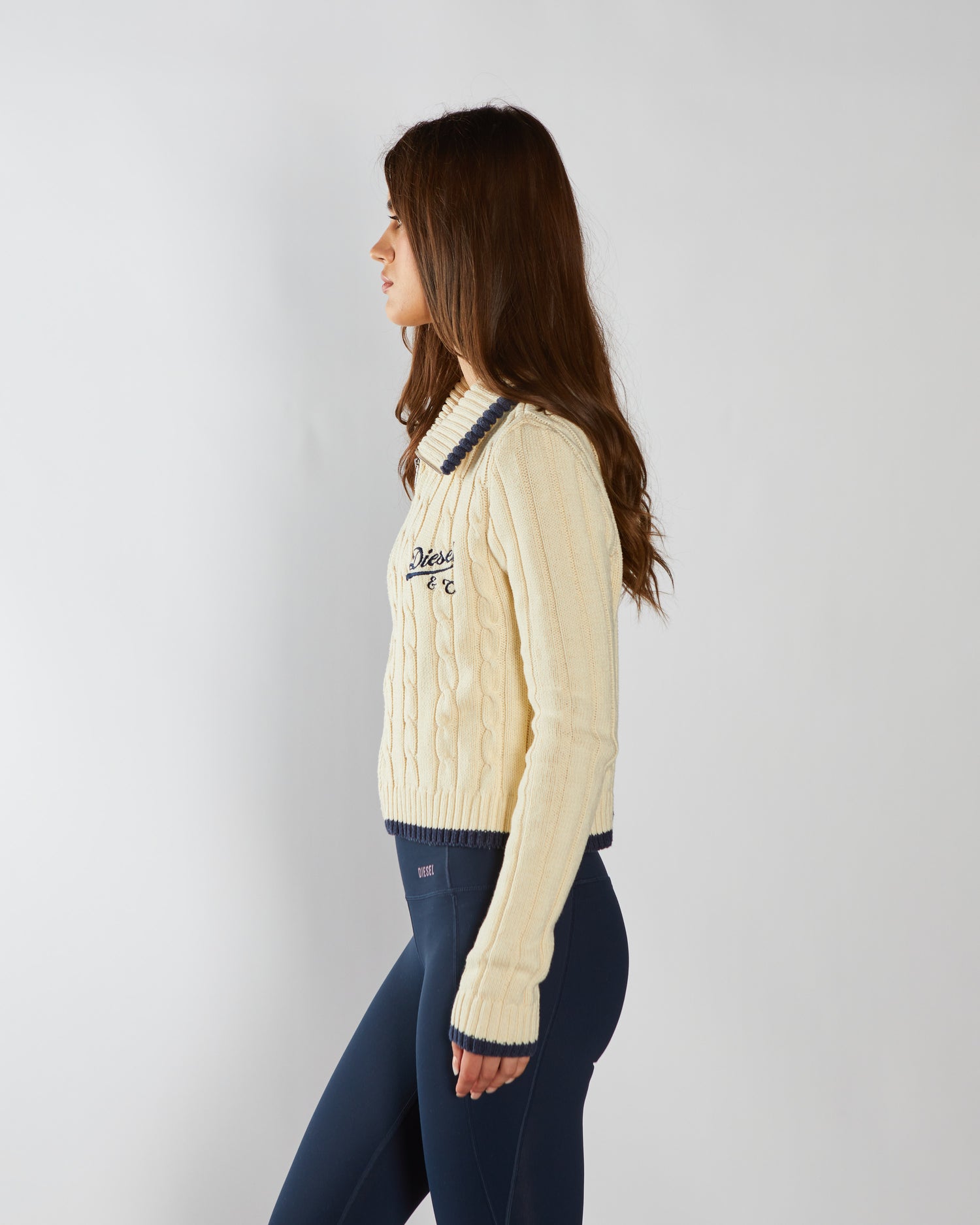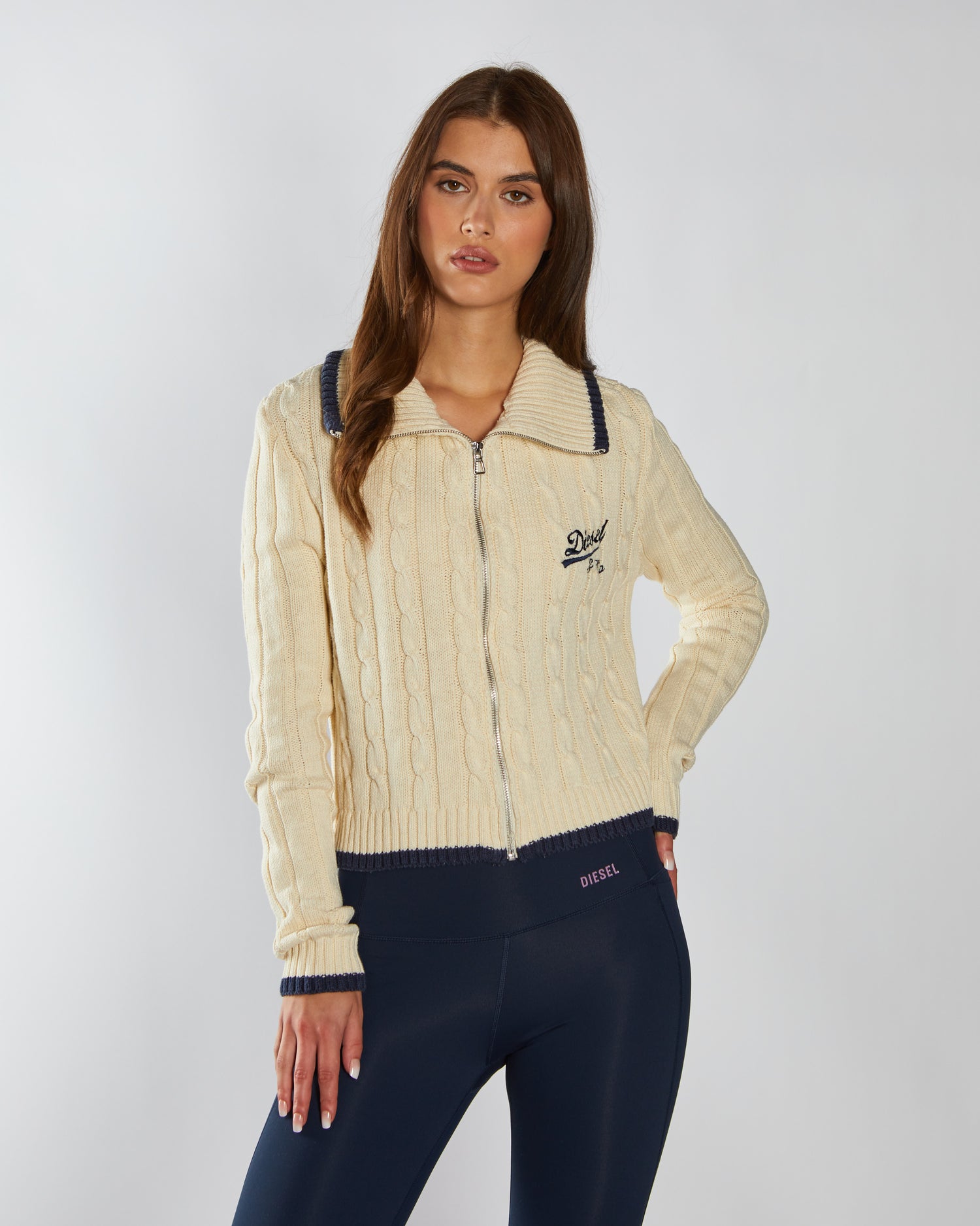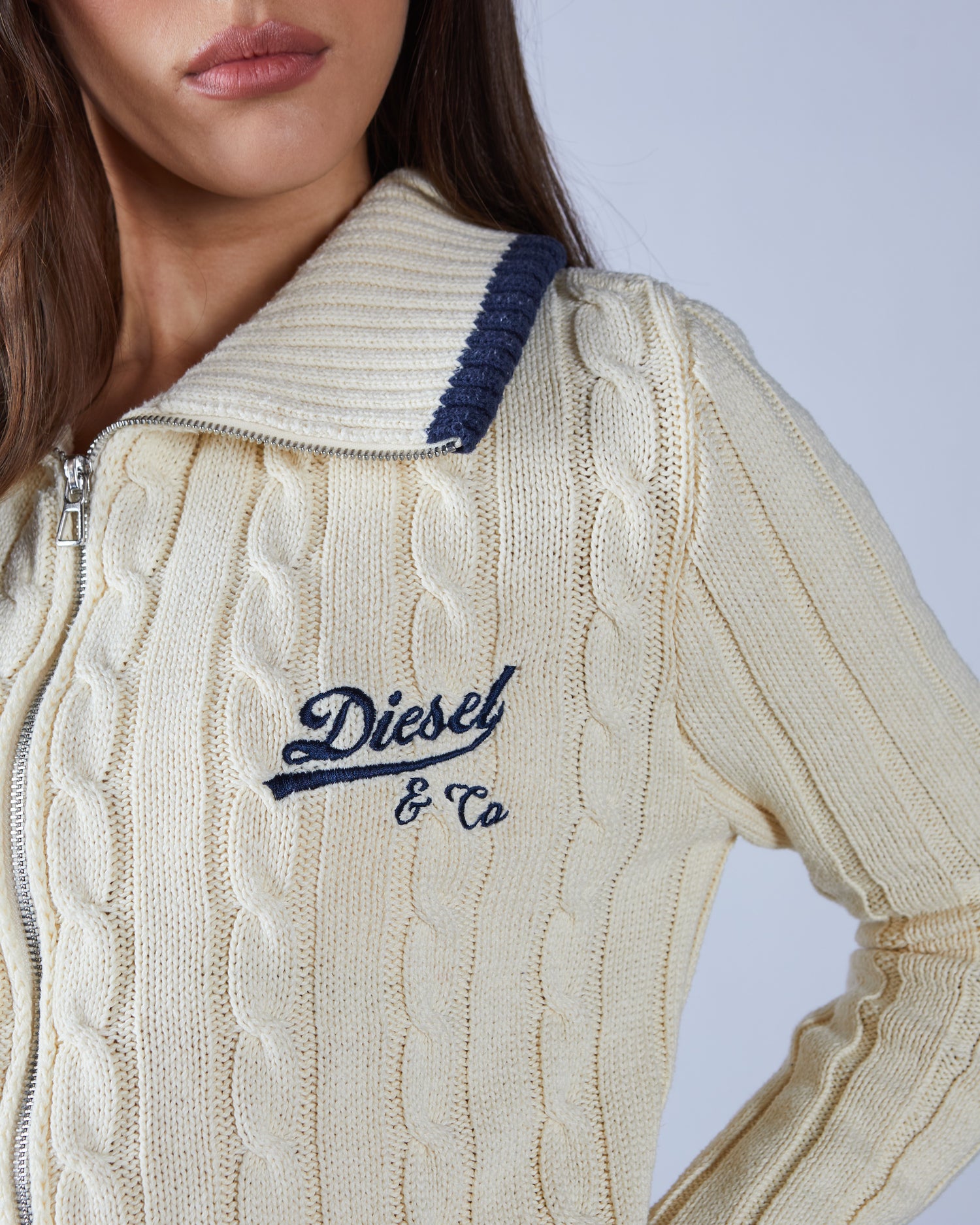 This slim-fit full-zip knit brings a subtle retro feel with its classic cable design with contrast knitted trims on the collar and cuffs. Made for elevated everyday wear. It’s finished with a full branded metal zip and features premium DIESEL embroidery on the chest.
