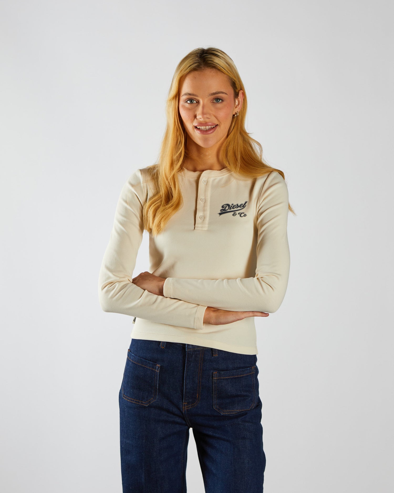 This cotton-rich long-sleeve henley is made with 1x1 rib for a smooth, flexible fit that moves with you. Designed in a slim fit, featuring a classic button closure it keeps things comfortable. Finished with a premium rubber-printed DIESEL logo on the chest, it’s a simple everyday staple.