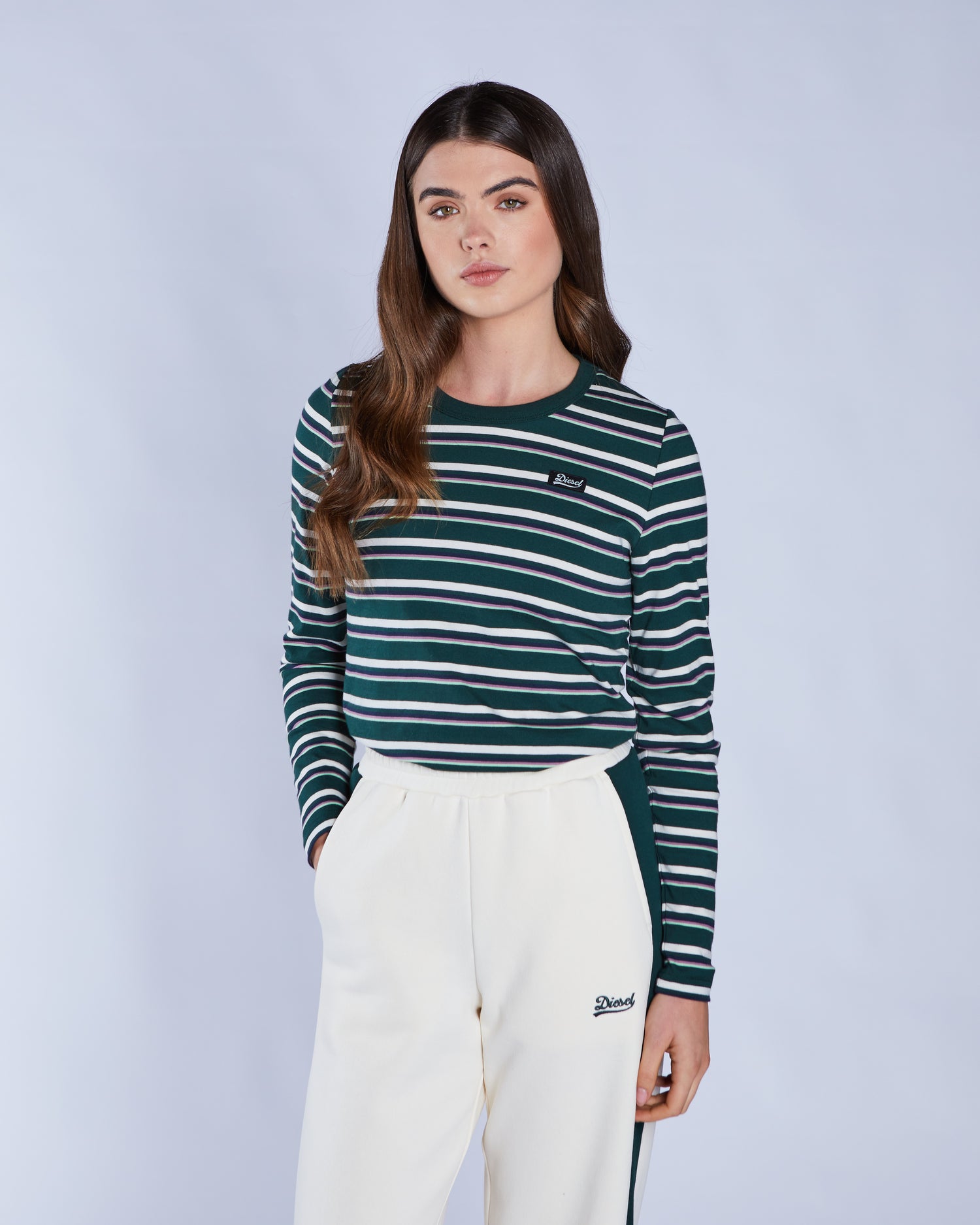 This long sleeve top features a striped fabric design and a regular fit for everyday comfort. The solid colour neck trim adds a clean contrast, while a woven label on the chest keeps the branding subtle. An easy essential for elevated everyday wear.