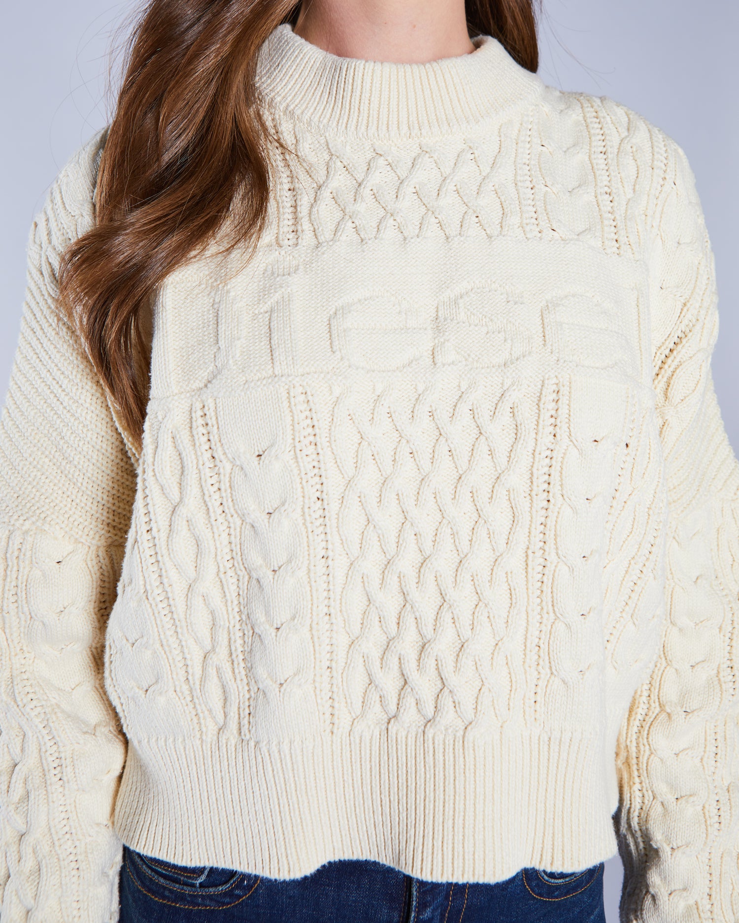 Introducing our round neck knit sweater featuring a classic cable knit texture that adds depth and dimension to your everyday look. Designed with a regular fit, ribbed cuffs and hem, and a DIESEL logo is seamlessly integrated into the knit at the chest.