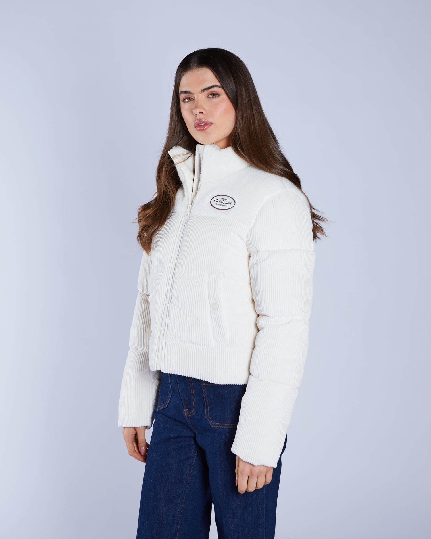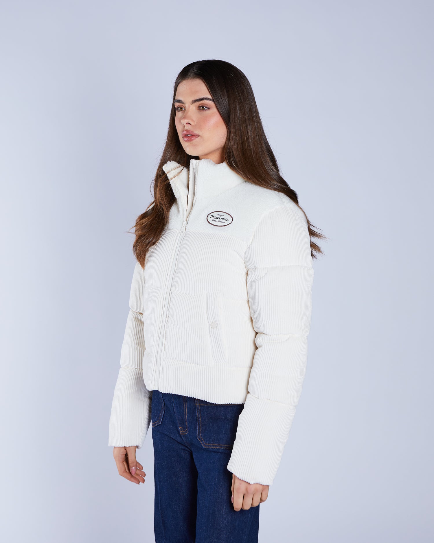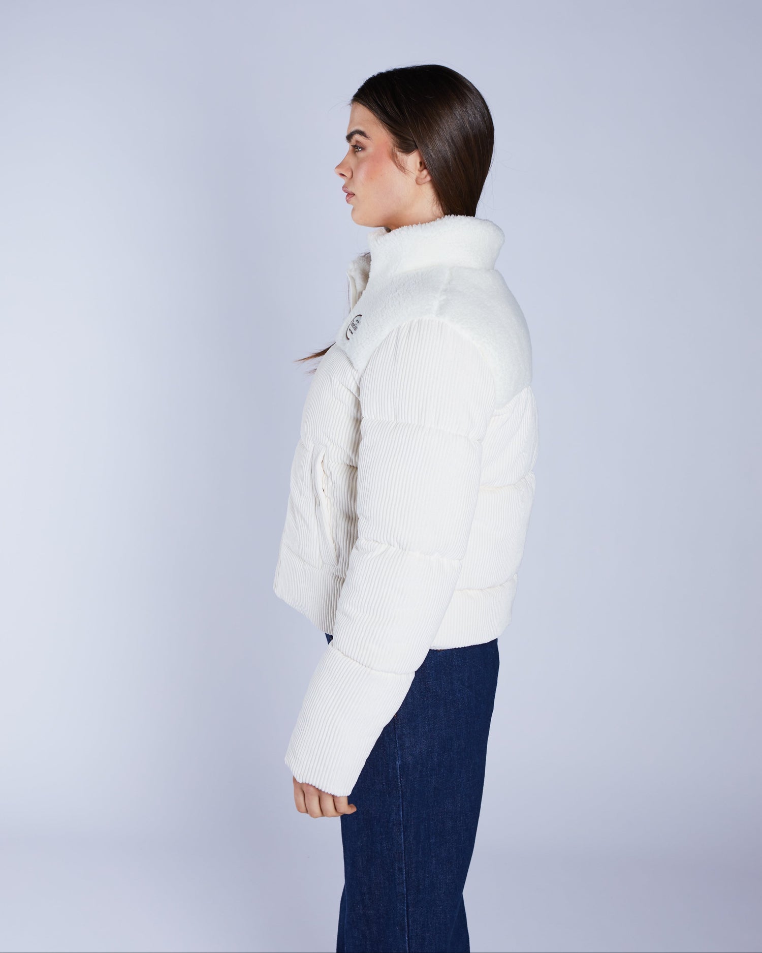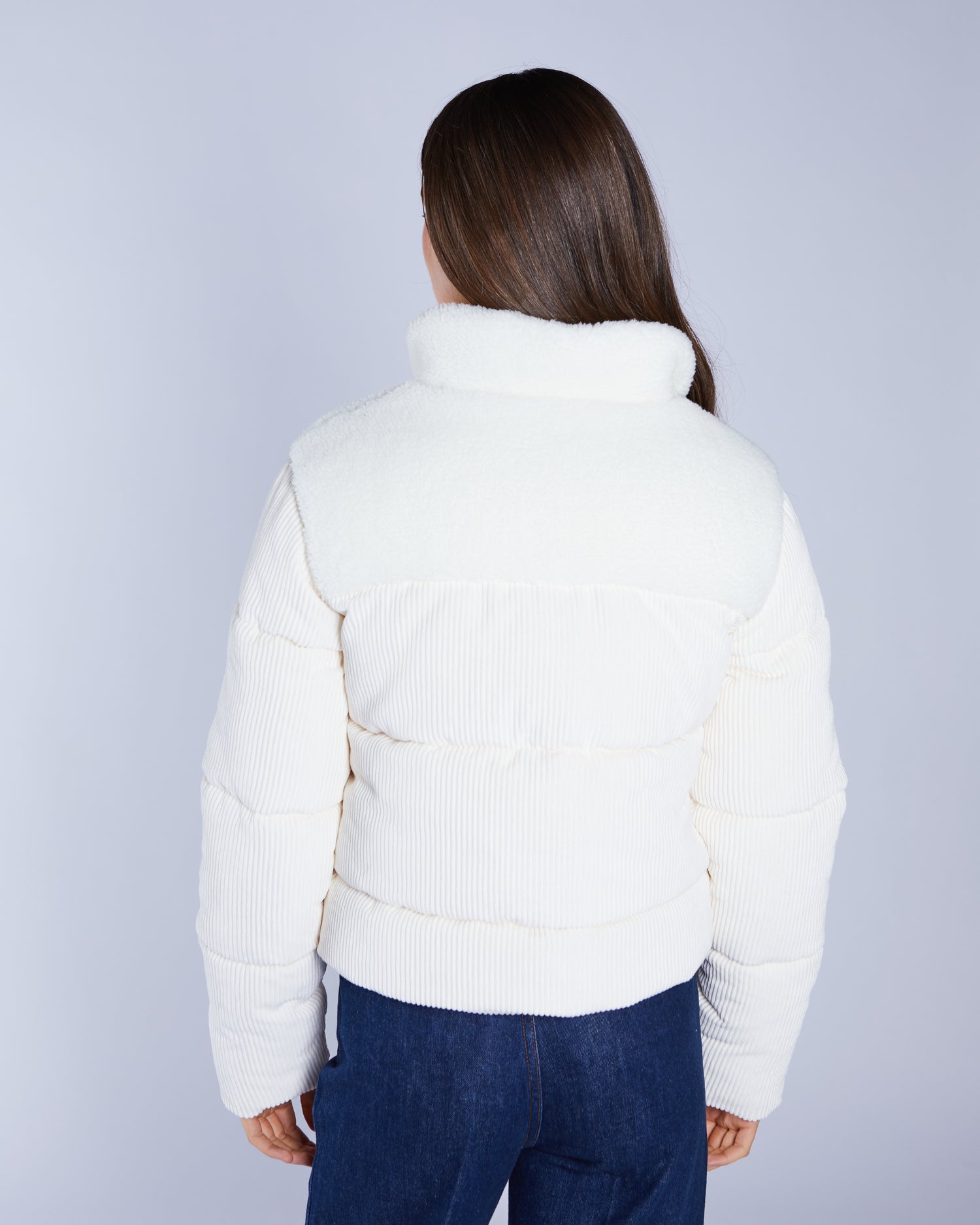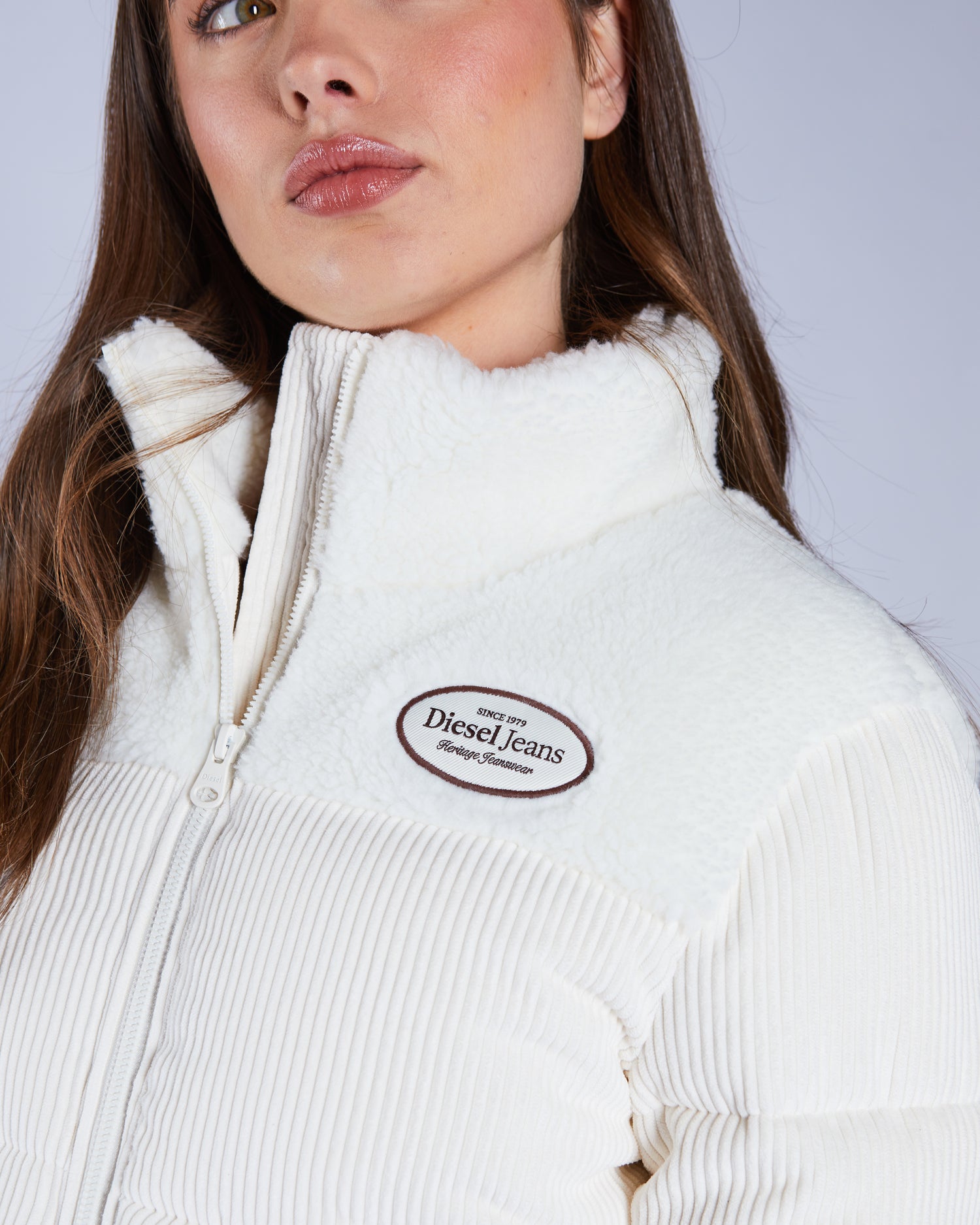 Introducing our short corduroy puffer jacket with contrast sherpa panel. Woven DIESEL badge on wearer's right chest. This stylish jacket features welted side pockets complemented by metal snap buttons for a polished finish, as well as a front zip closure.