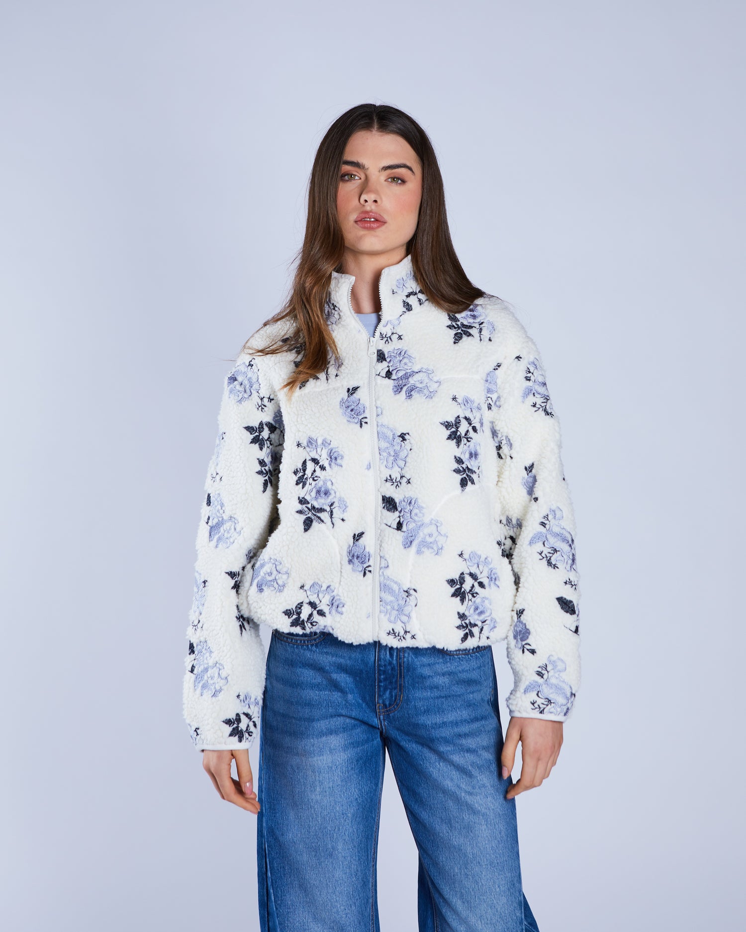 Introducing our plush teddy sherpa jacket featuring all-over embroidered florals. Branded DIESEL embroidery on wearer's front pocket. This stylish jacket features a front zip closure complemented with an elasticated hem, ensuring a snug, flattering fit that moves with you.