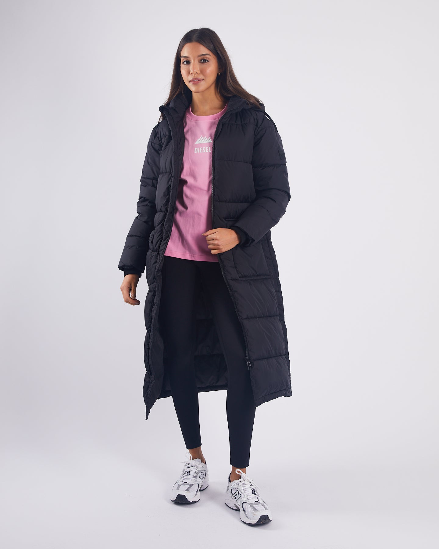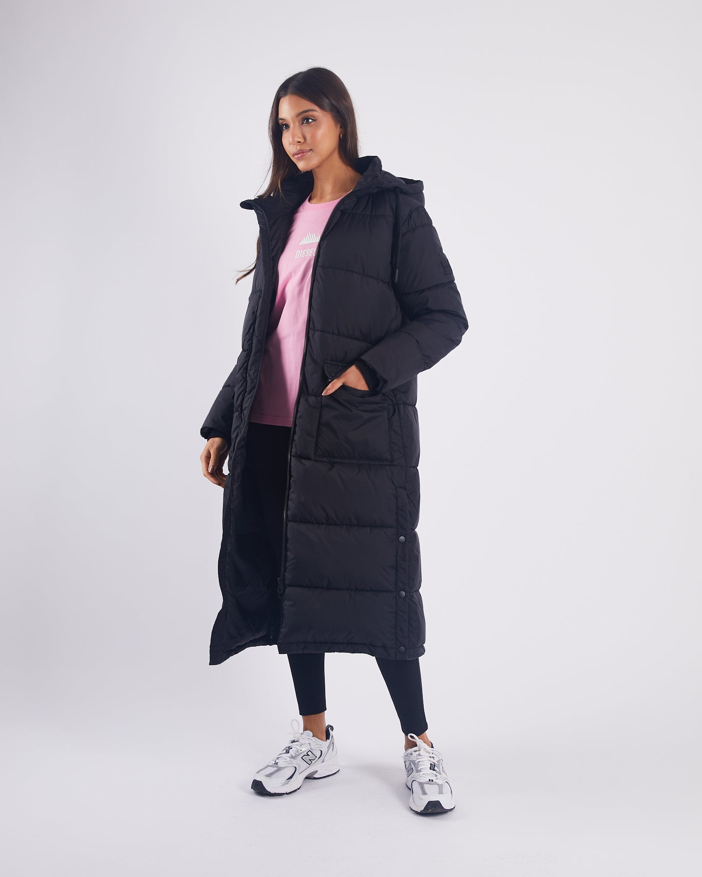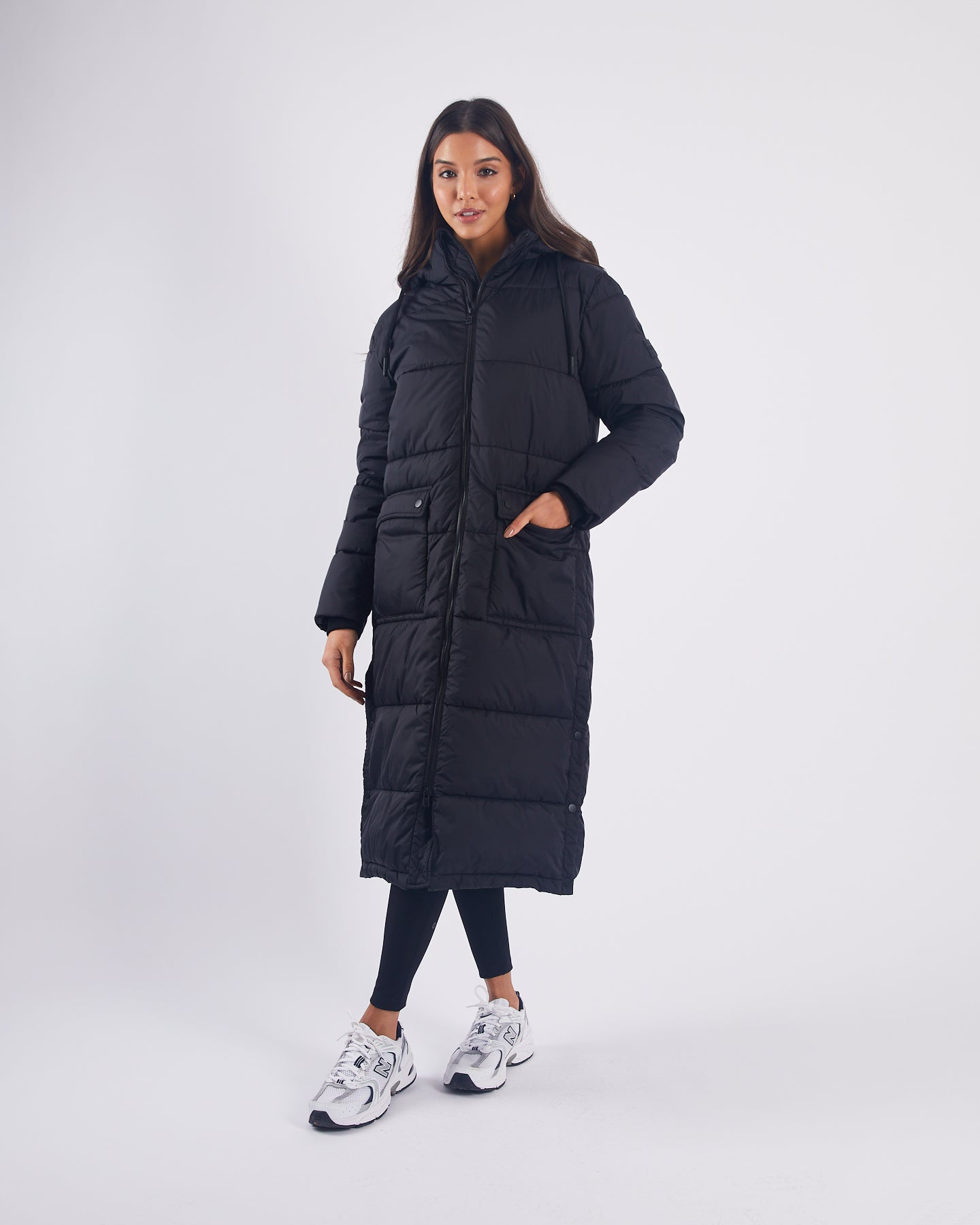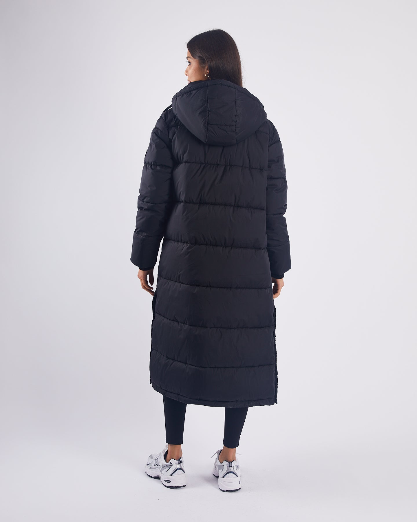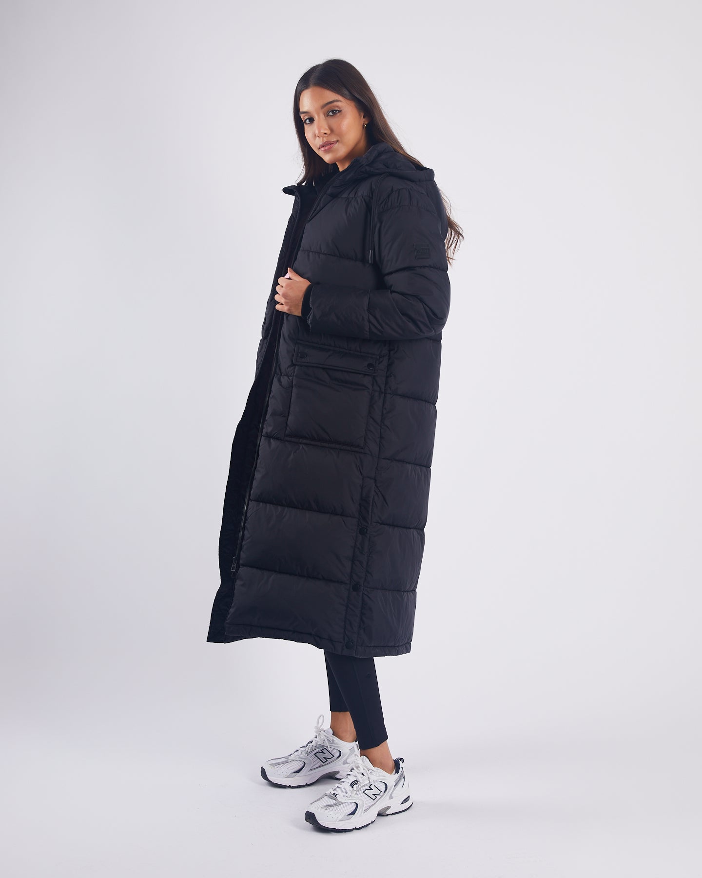 Long length hooded puffer jacket with patch pockets on front and snaps up the side seam for movement.