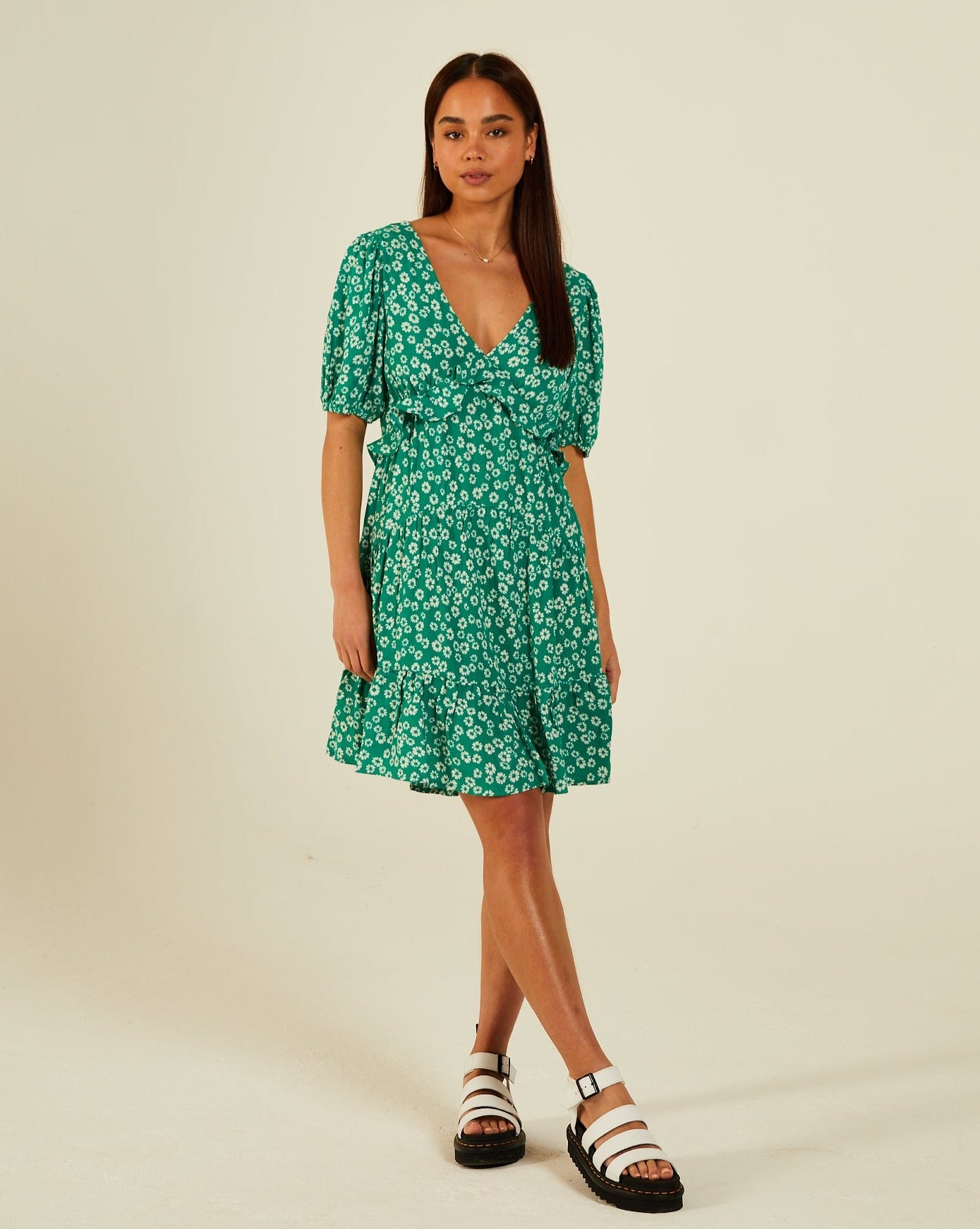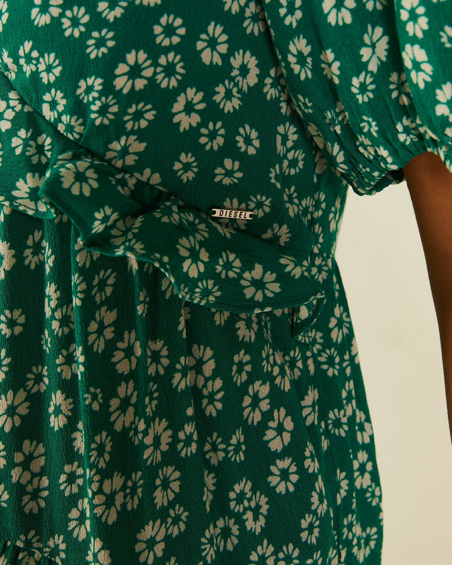 Printed viscose mini dress with a front ruffle, puff sleeves and cutout back panel with fabric ties. Branded with a Diesel metal badge. Model wears XS. It is recommended that you stick to your regular size. 90% viscose, 10% silk