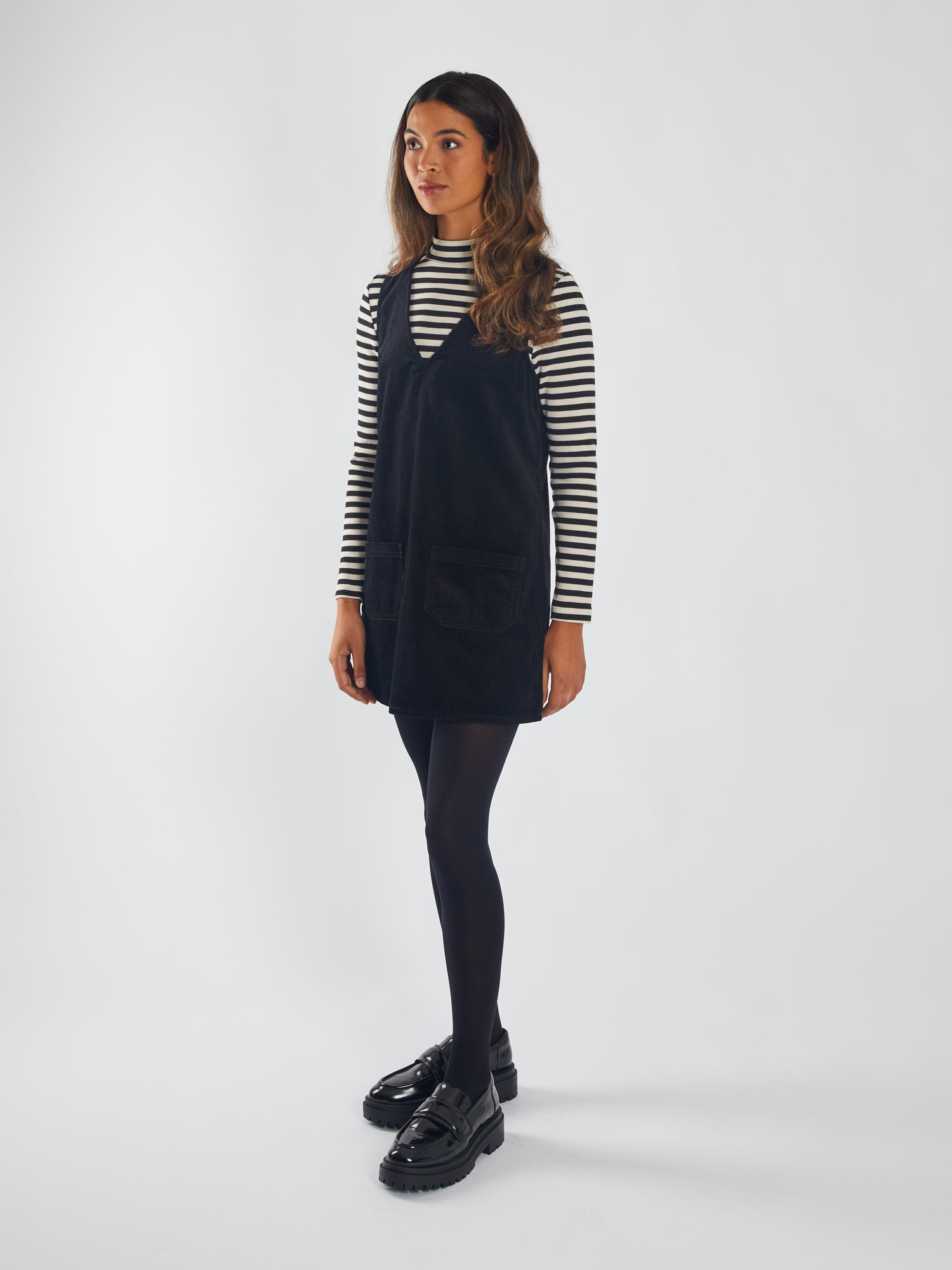 Corduroy pinny dress with deep V-neckline and pockets. Pair with our striped Marni Tee