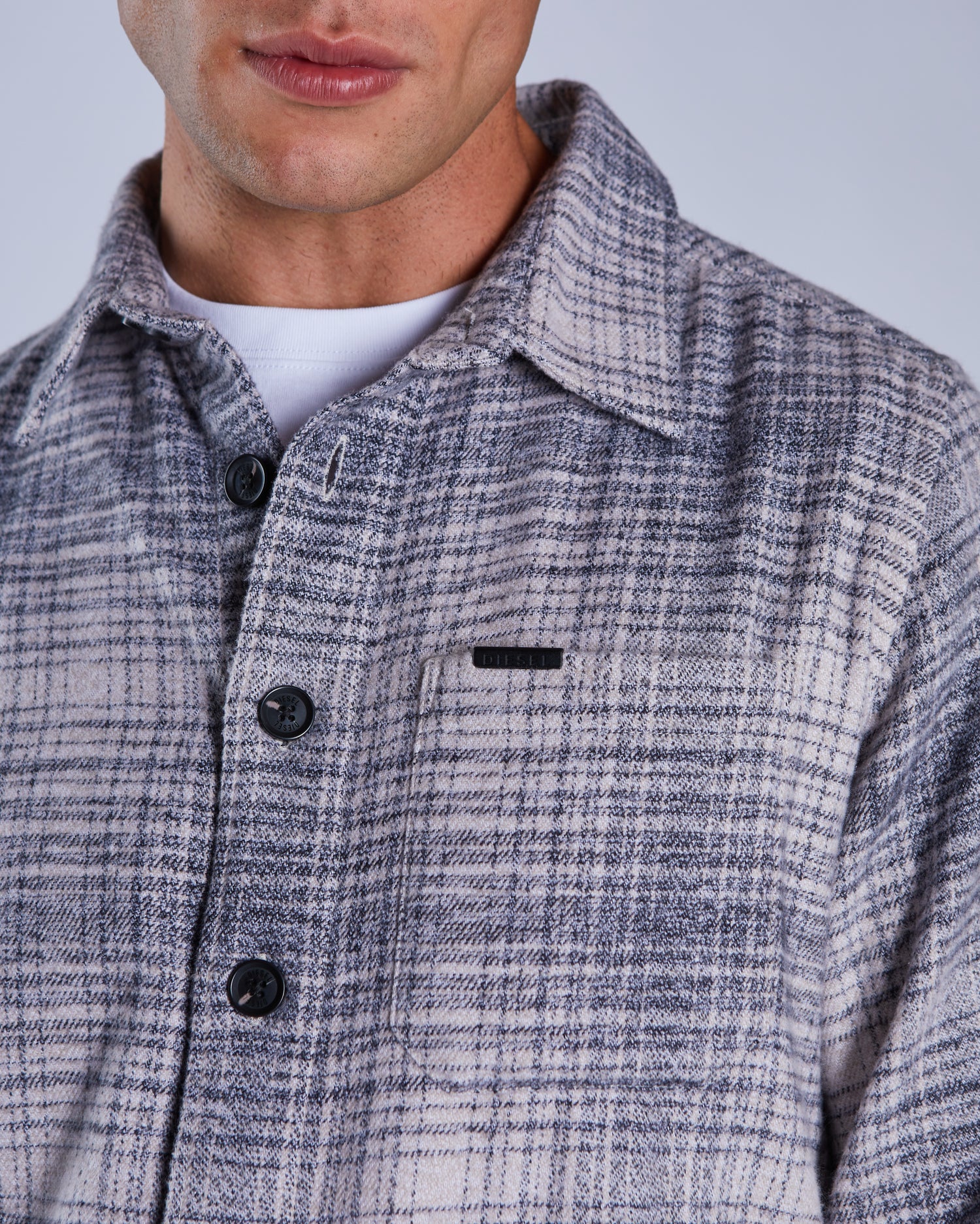 This checked overshirt is crafted from a supersoft brushed fabric, it has a fluid drape and isn't stiff, making it comfortable and easy to layer. It features a single chest pocket with our Diesel black metal badge. Layer over our white basic Tee and Rio Relaxed Straight Grey Jean.