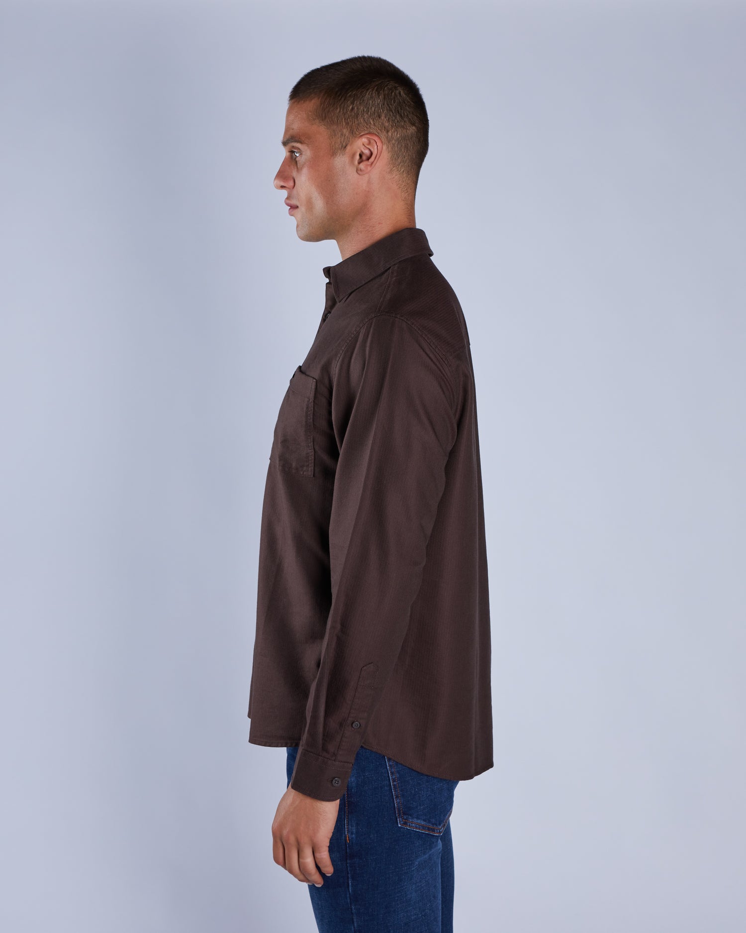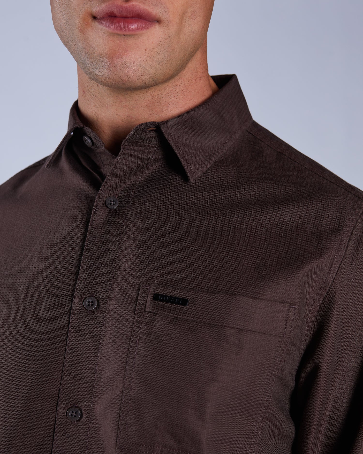 The perfect shirt to elevate your winter wardrobe. It is crafted from a herringbone weave fabric, this relaxed fit shirt has a fluid drape and isn't stiff, making it comfortable and easy to layer. It features a single chest pocket with our Diesel black metal badge. Pair with one of our basic T-shirts and Rio Relaxed Straight Grey Jean.