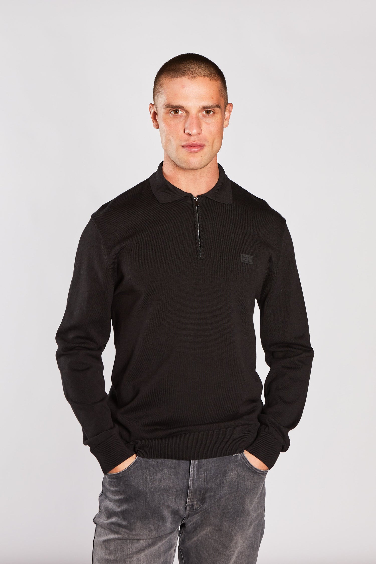 This clean crisp knitted polo features a classic collar and metal zip closure. It has ribbed cuffs and hem for comfort. It has a branded zip puller and Diesel badge at the chest.
