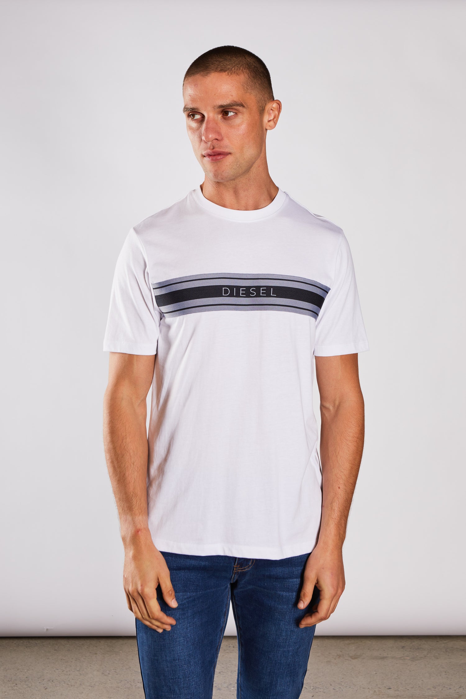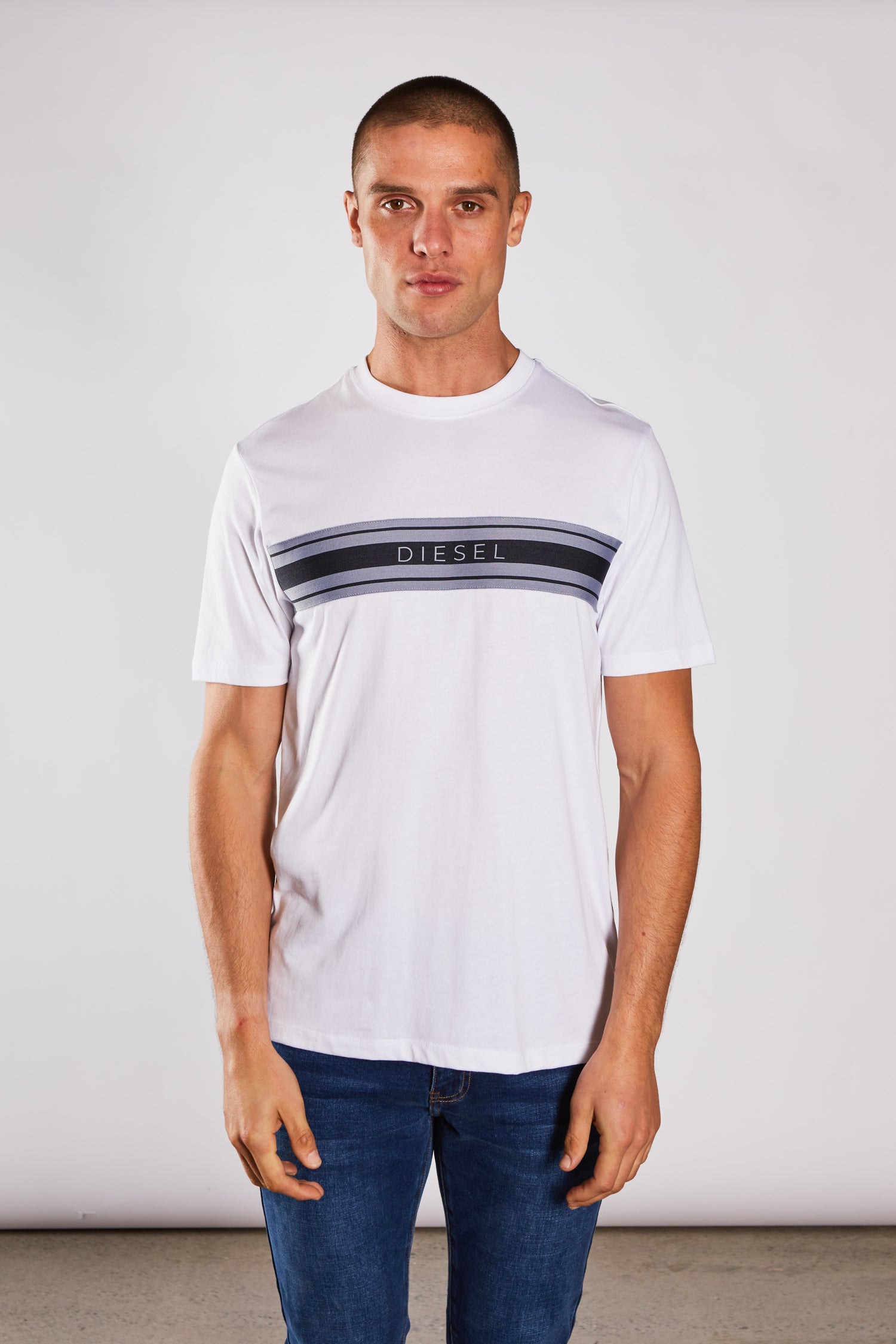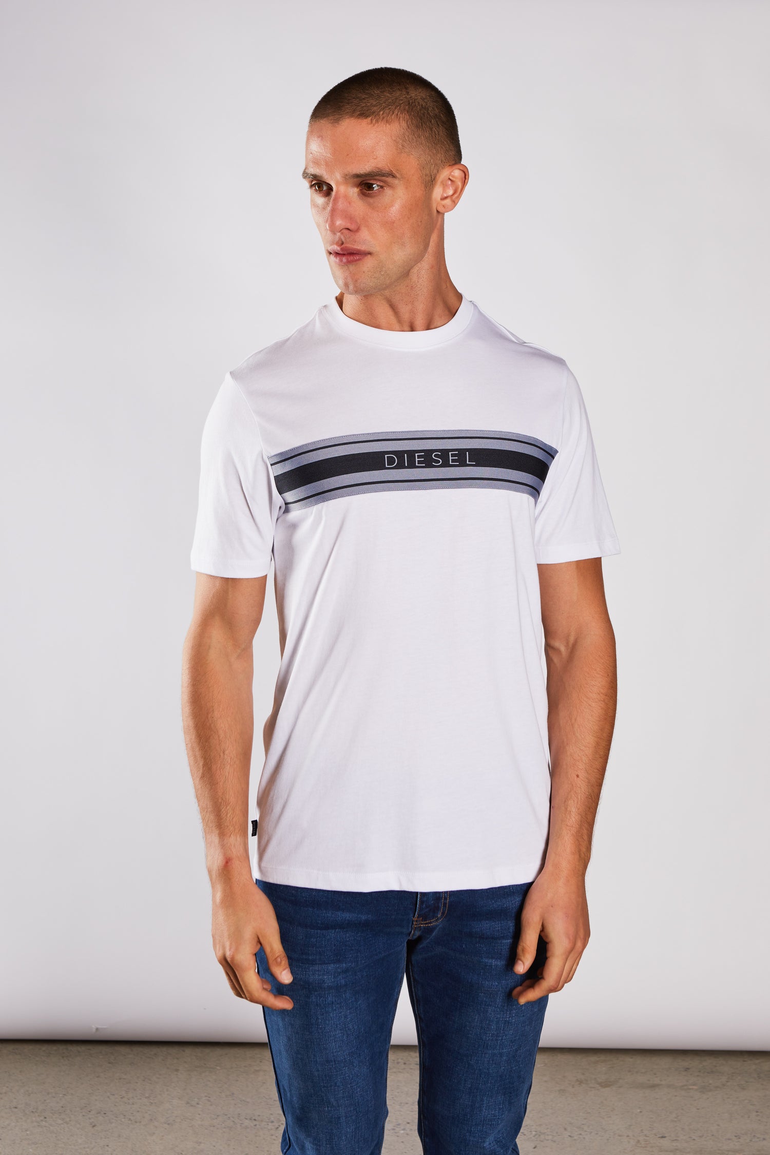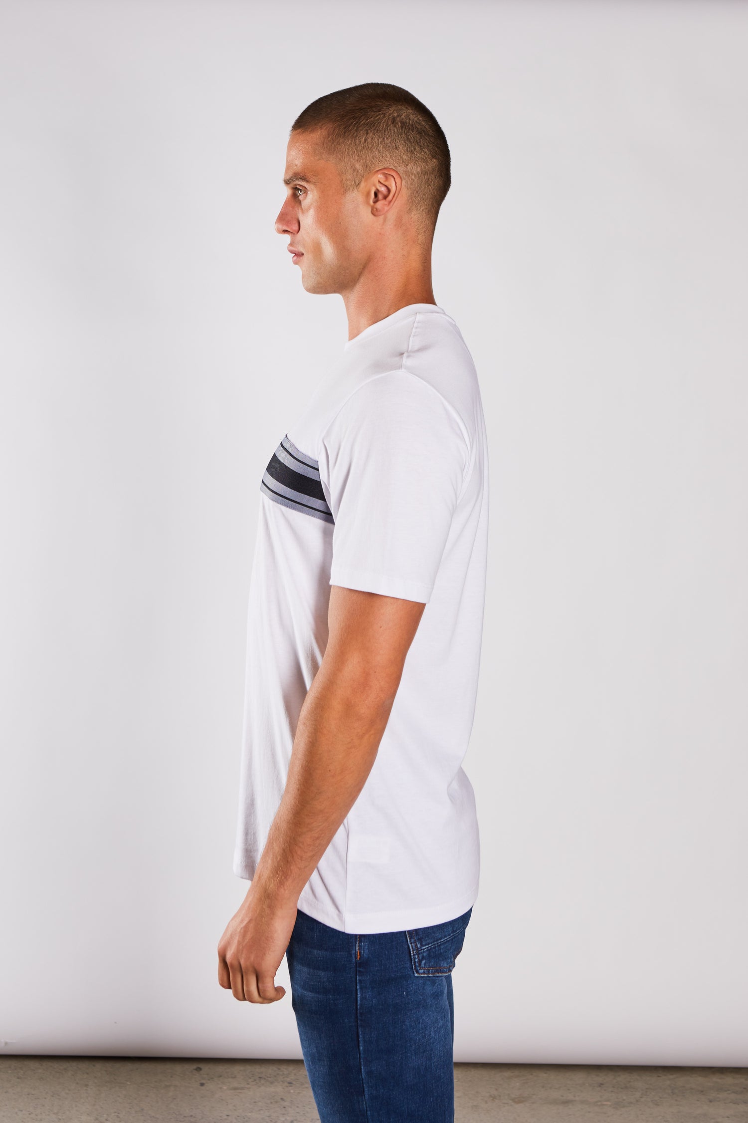 Premium organic cotton jersey t-shirt. Knitted striped tape on the chest. Pair with a pair of our jeans & a smart sweat style for a smart causal look