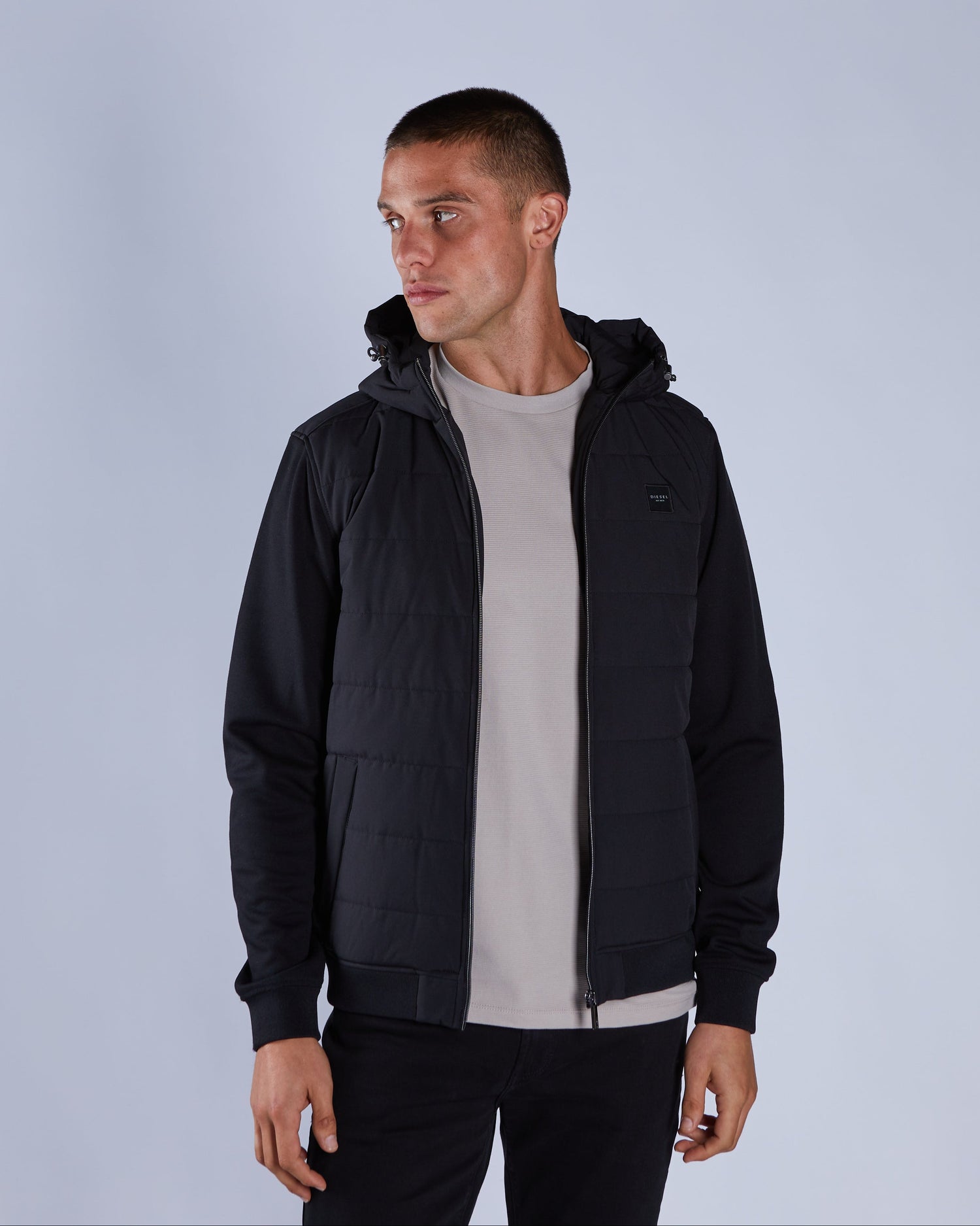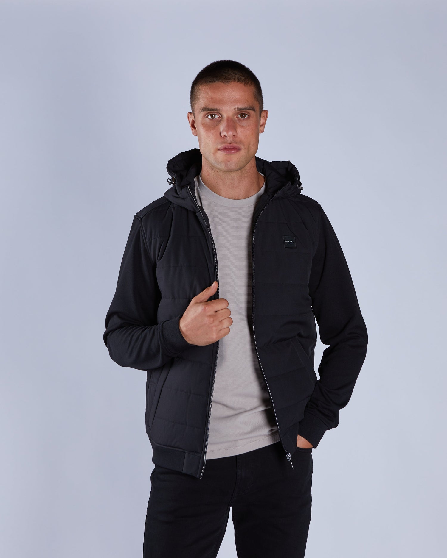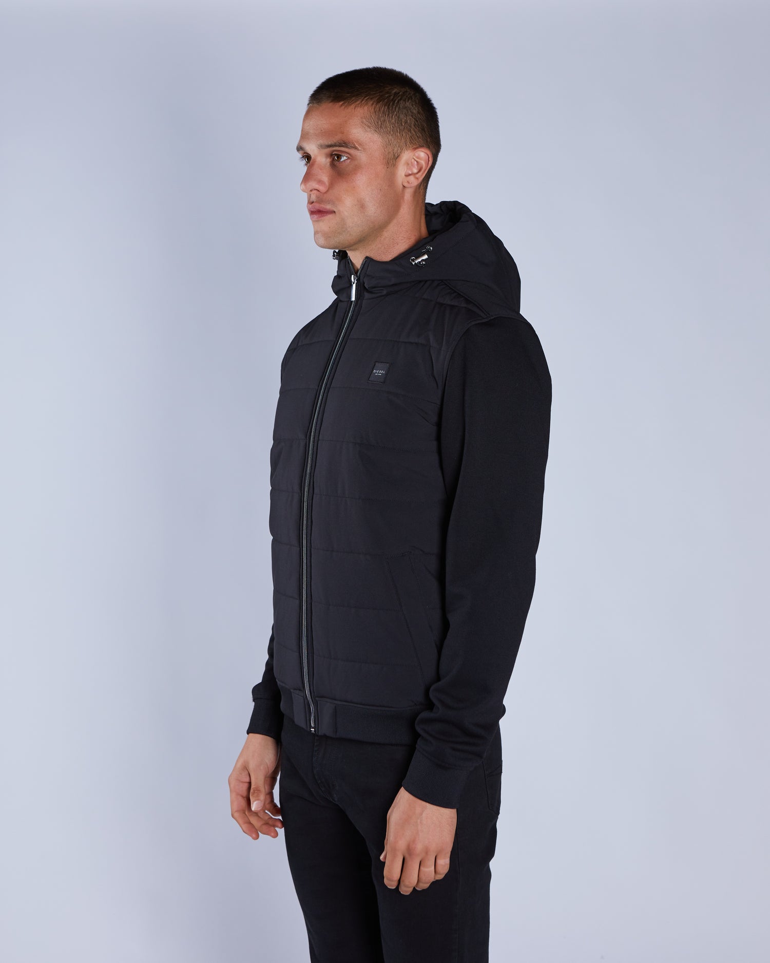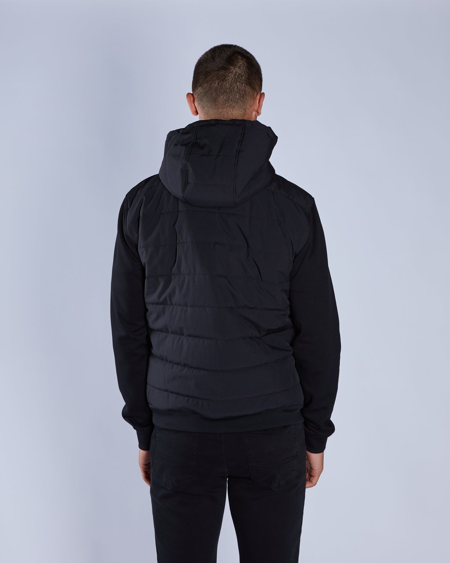 Men's hybrid jacket with quilted chest and hood. Soft, stretch sleeves and back panel, paired with ribbed cuffs and hem for comfort fit. It has our premium Diesel embroidered badge on chest.