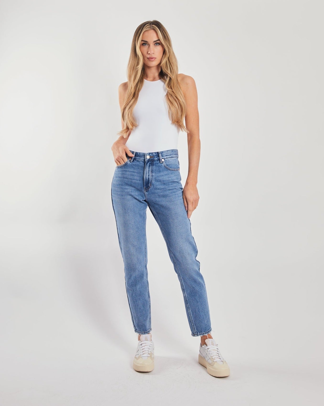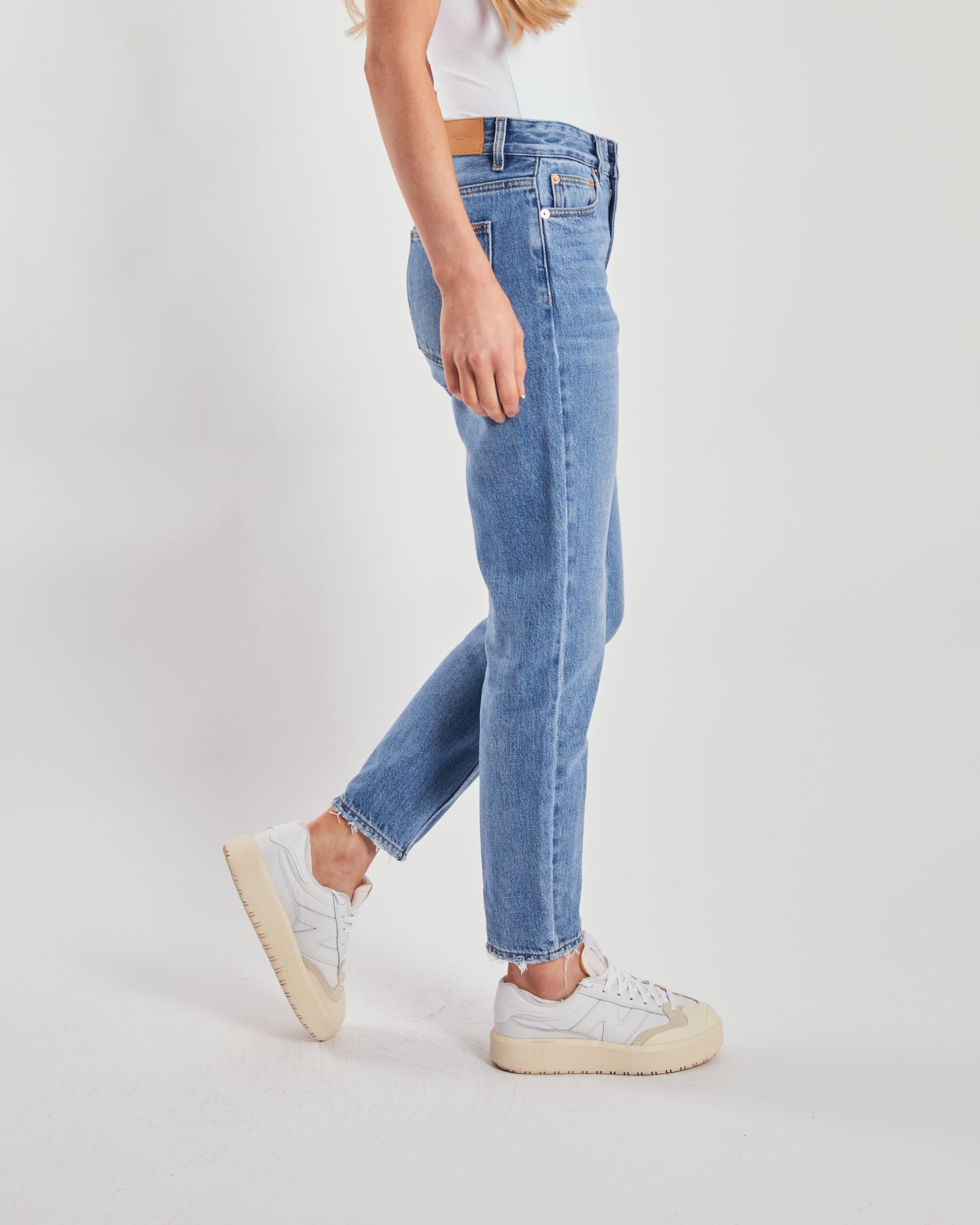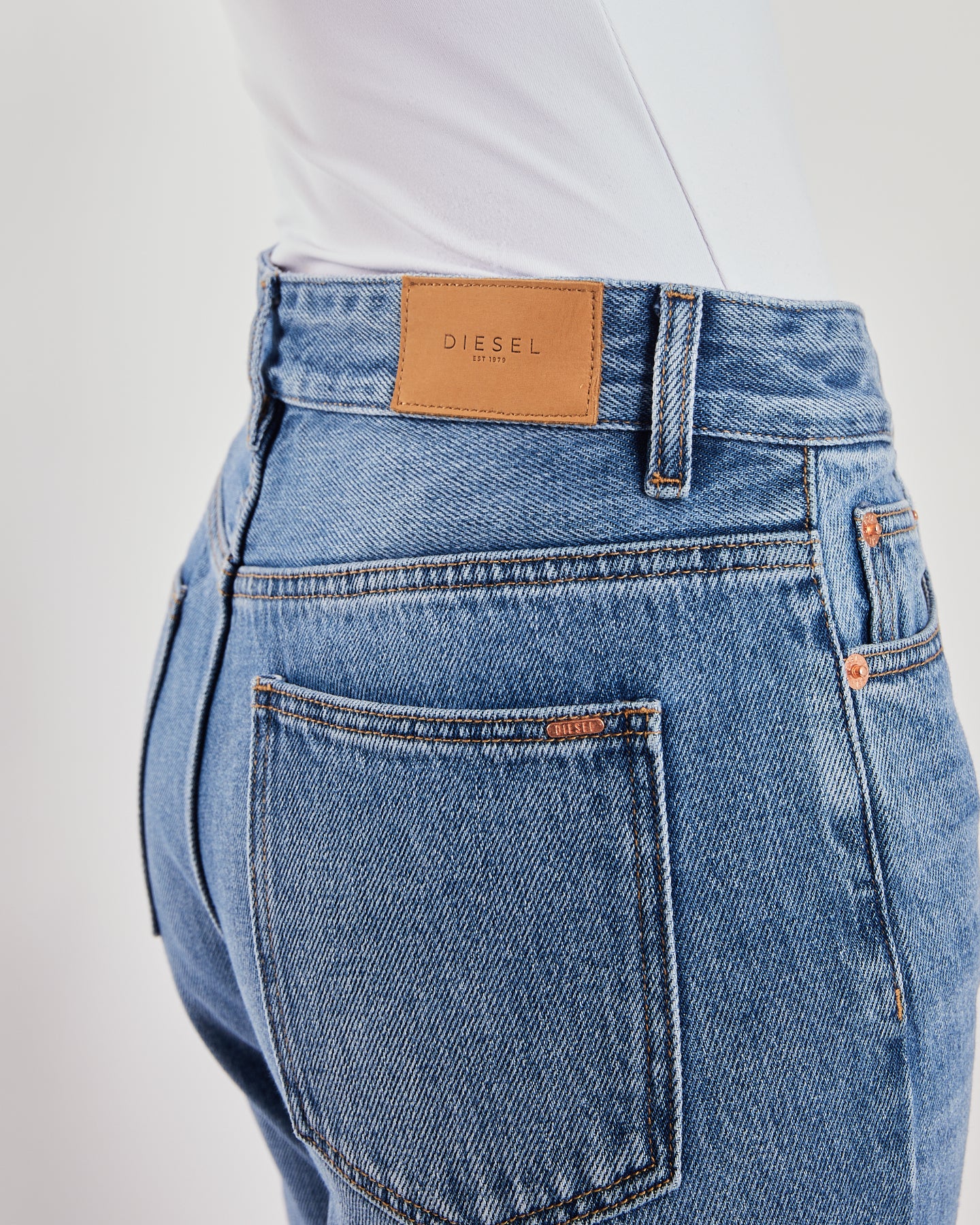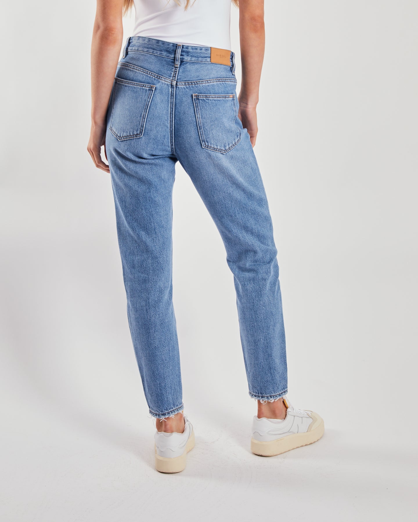 High Rise and tapered leg. This is a non stretch, medium blue mom jean, is the perfect relaxed look. Features a zip fly and Diesel branded hardware. Leg length is a shorter fit then our regular jeans.