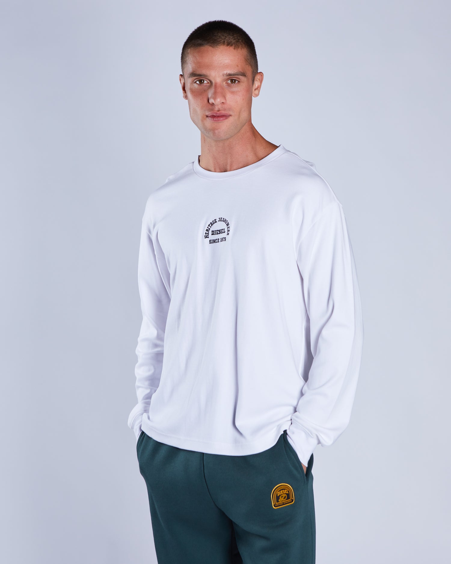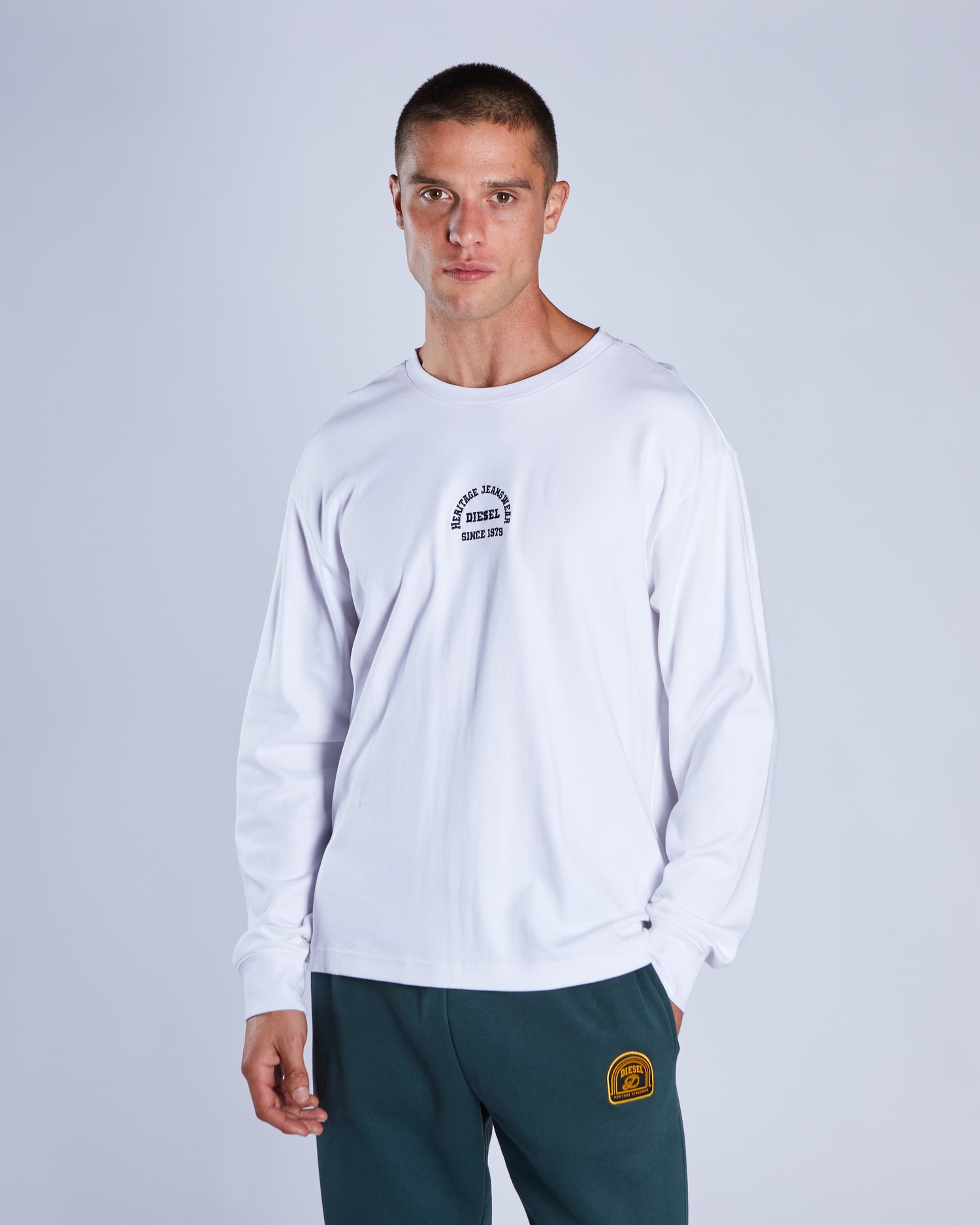 Part of our new varsity range; this mid-weight, soft, relaxed-fit long sleeve t-shirt features a chest embroidery and large back print with applique . Pair with our Finlay /uncuffed Jogger for the complete varsity look.