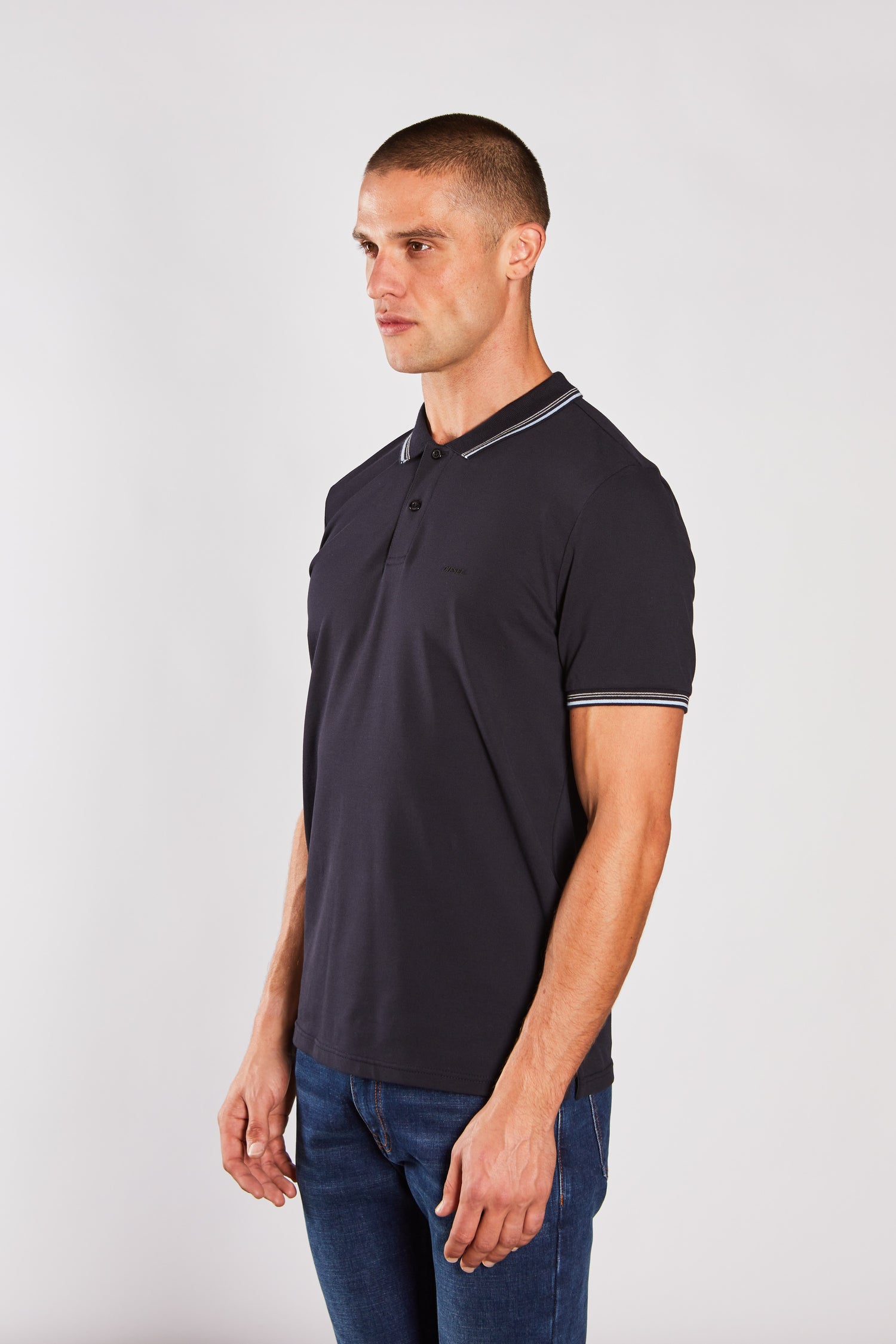 Our pique polo with added stretch for comfort, featuring a contrast collar and cuff stripe design, 2 button placket and DIESEL rubber chest badge. Pair with the Rio Relaxed Jean in Grey for a casual jeanswear look.