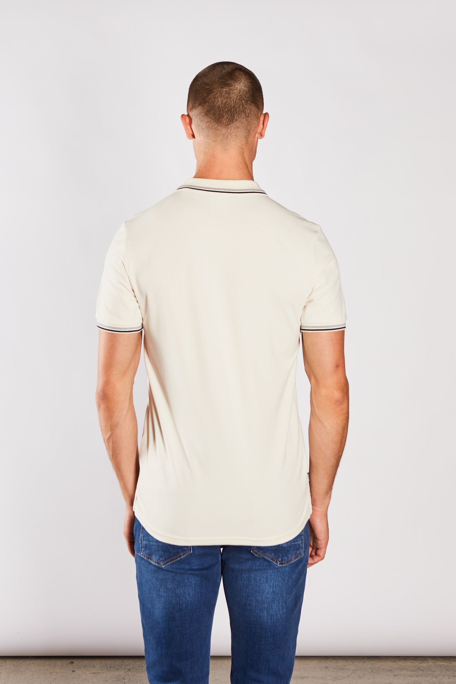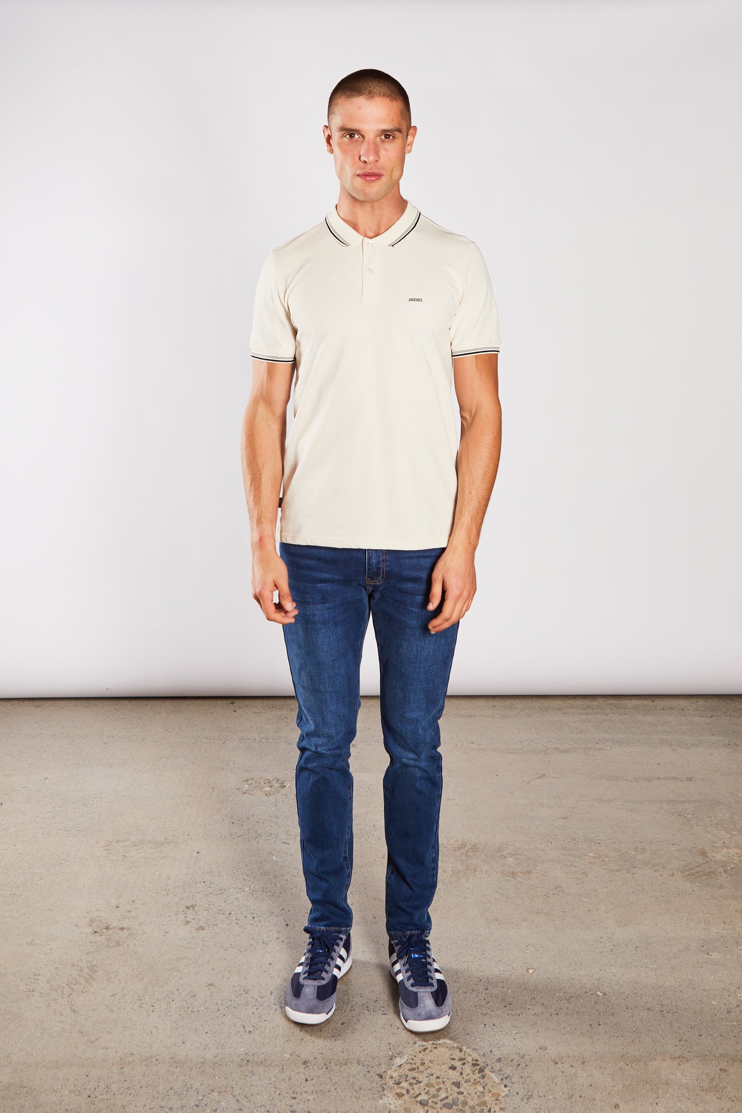 Our pique polo with added stretch for comfort, featuring a contrast collar and cuff stripe design, 2 button placket and DIESEL rubber chest badge. Pair with the Rio Relaxed Jean in Grey for a casual jeanswear look.