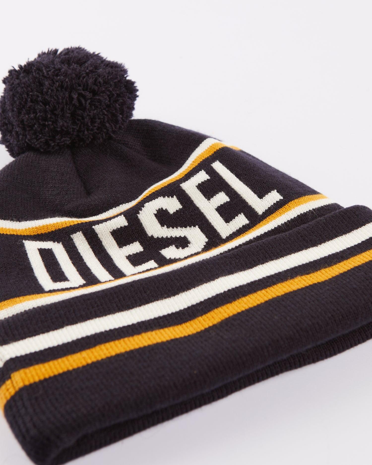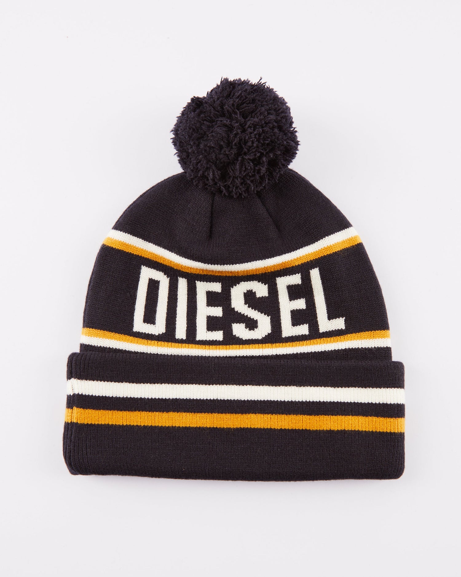 Close fit hat for comfort and warmth. Branded 'Diesel' jacquard with contrast stripes at front and back . Mixed yarn bobble.