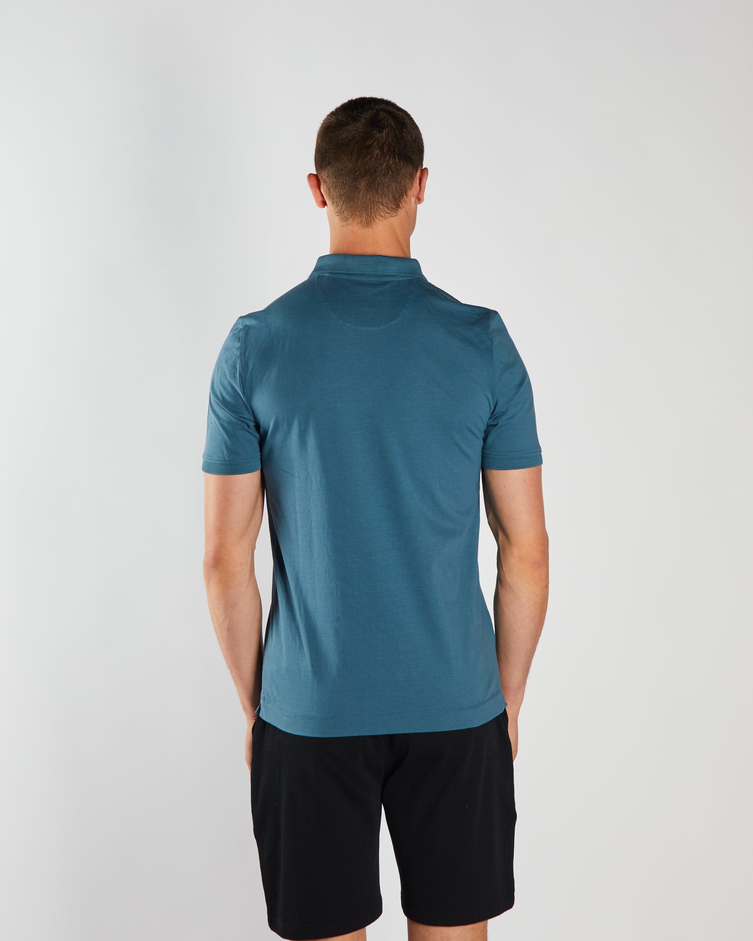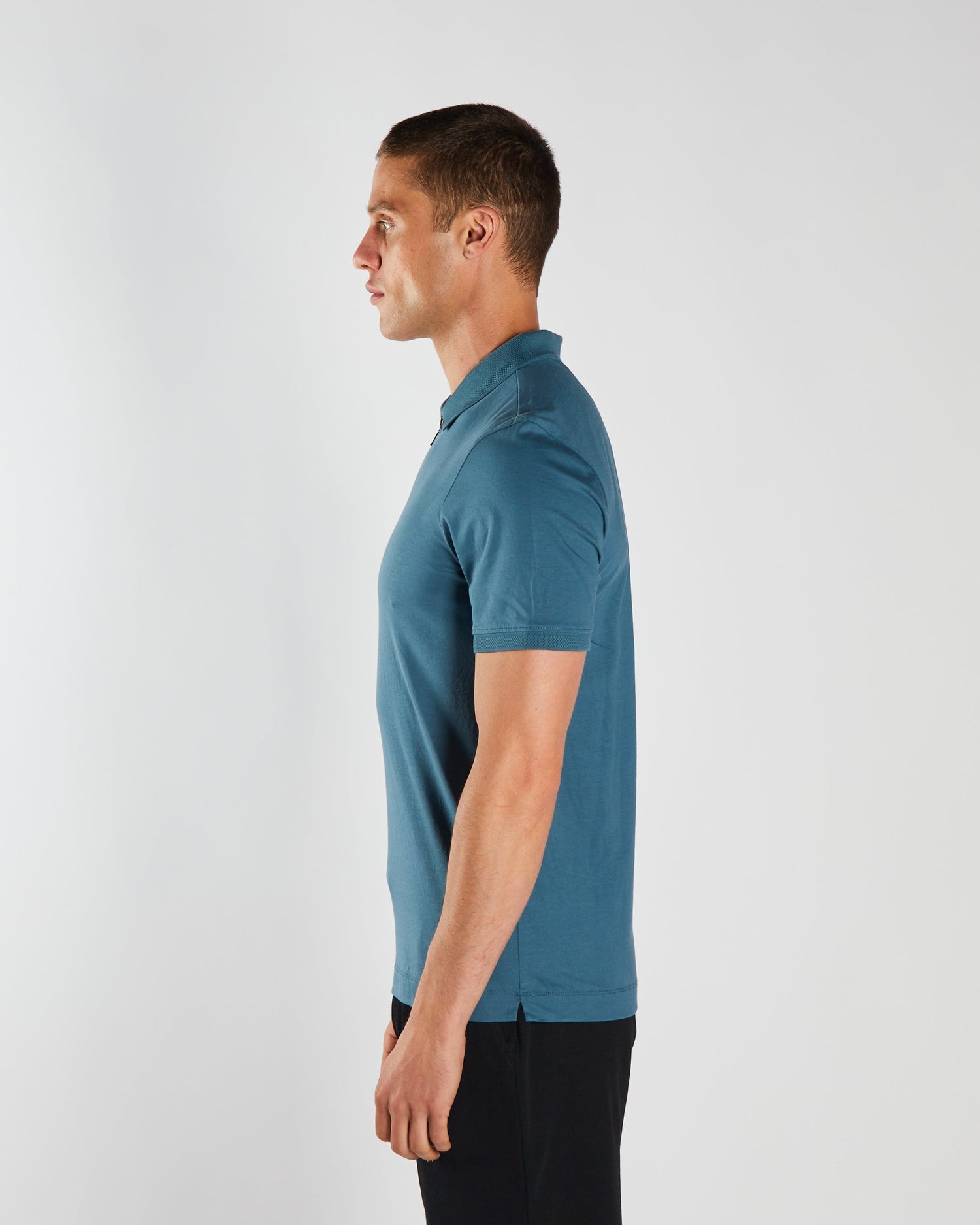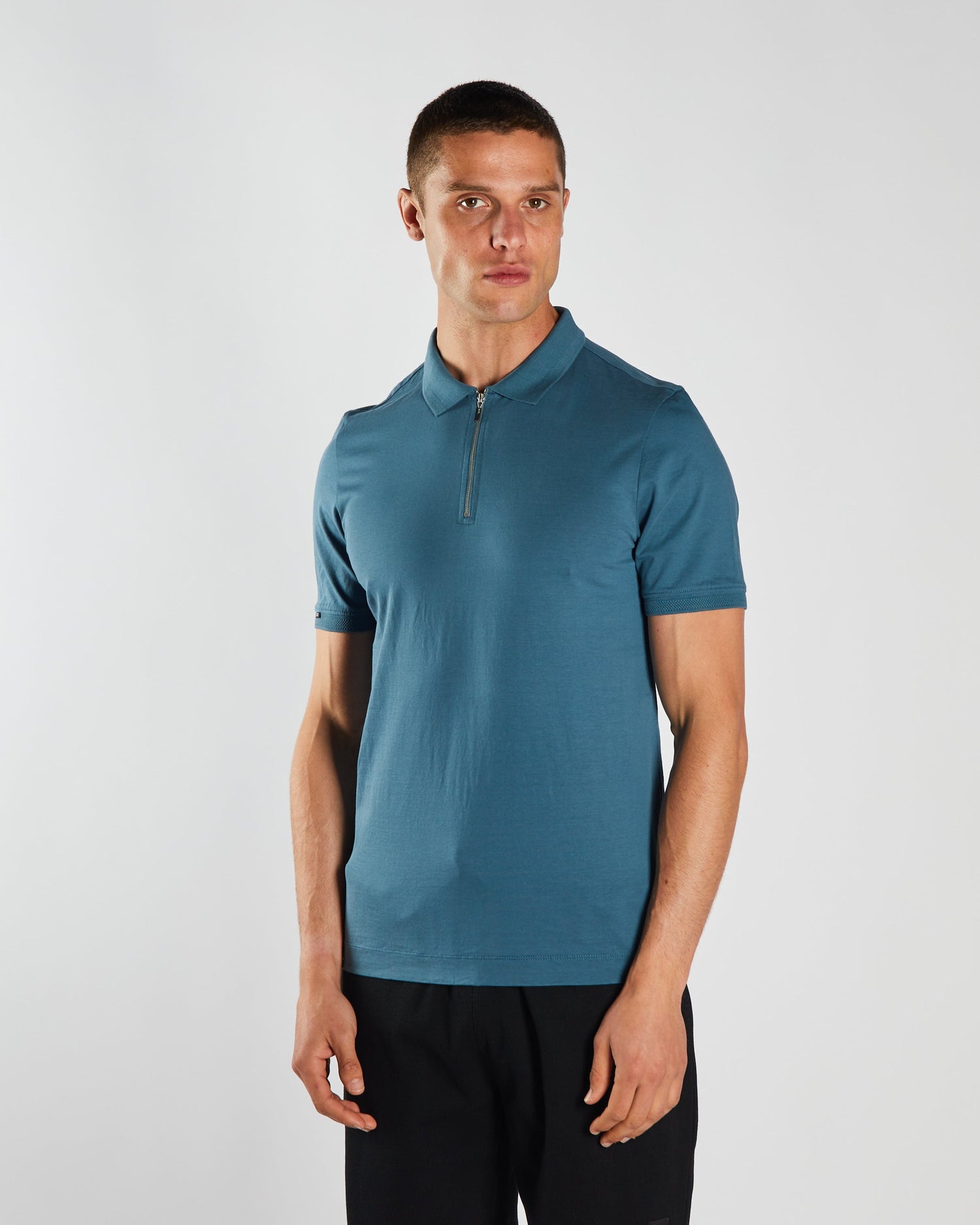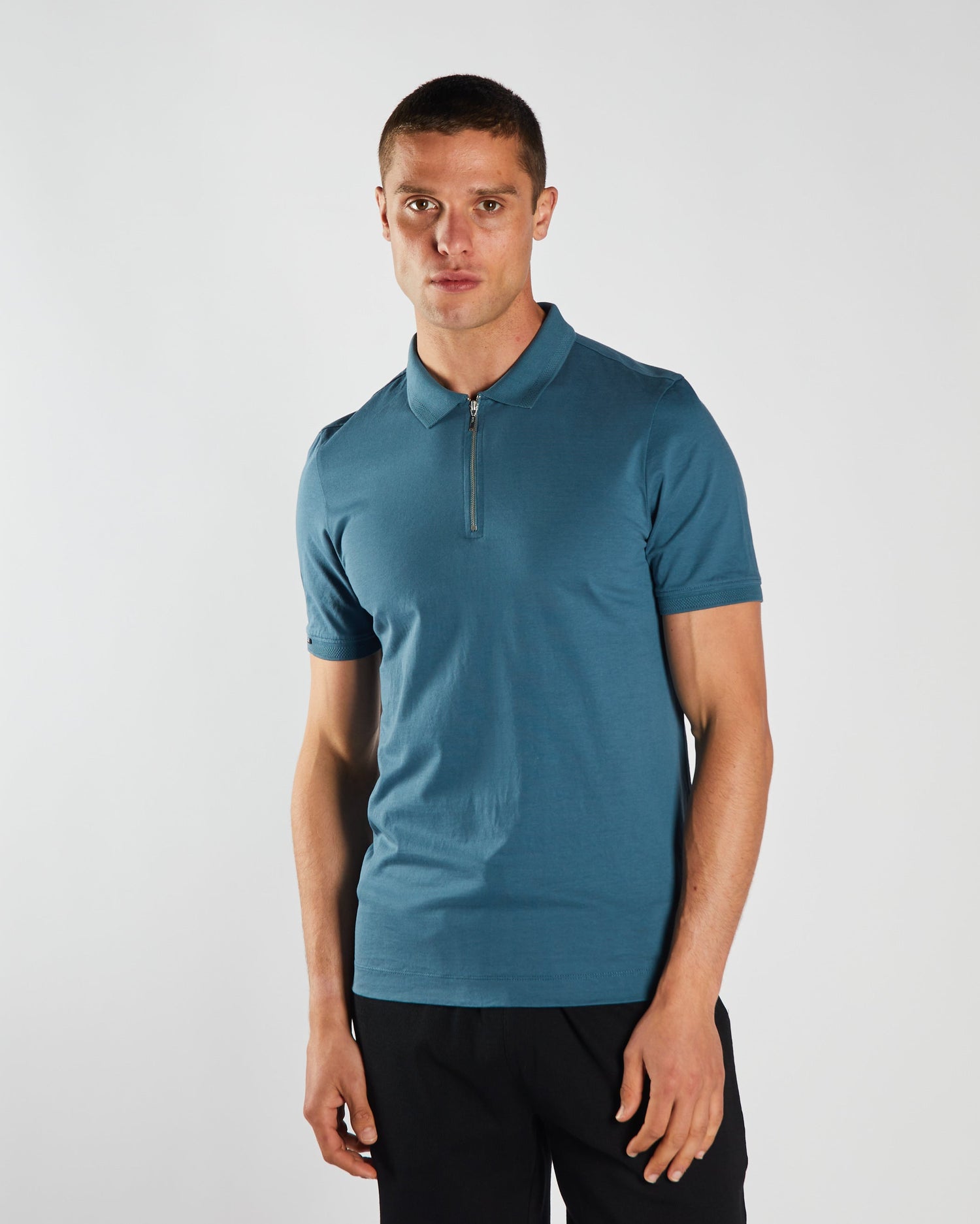 Men's jersey polo with Zip detail, branded woven badge on the sleeve.
