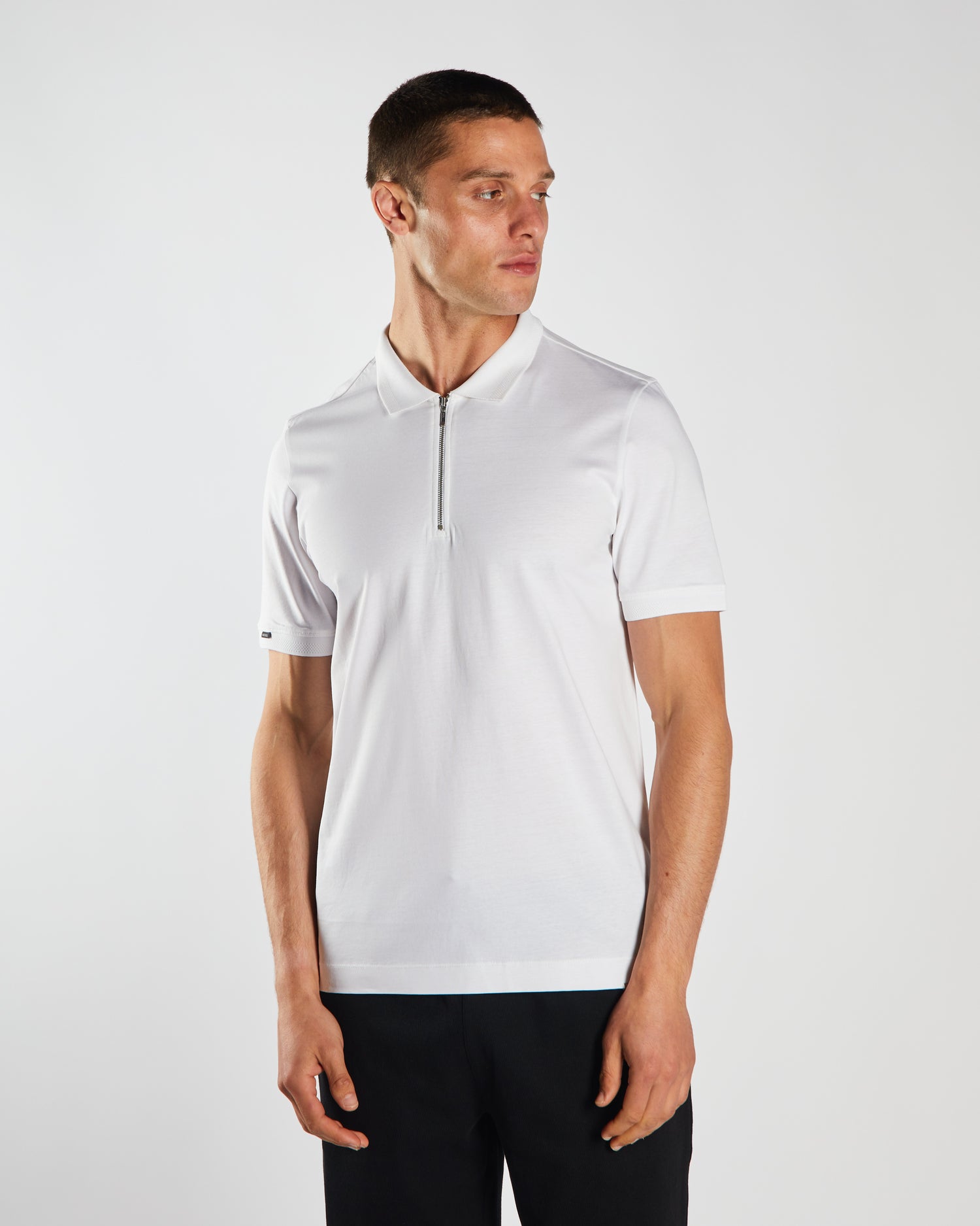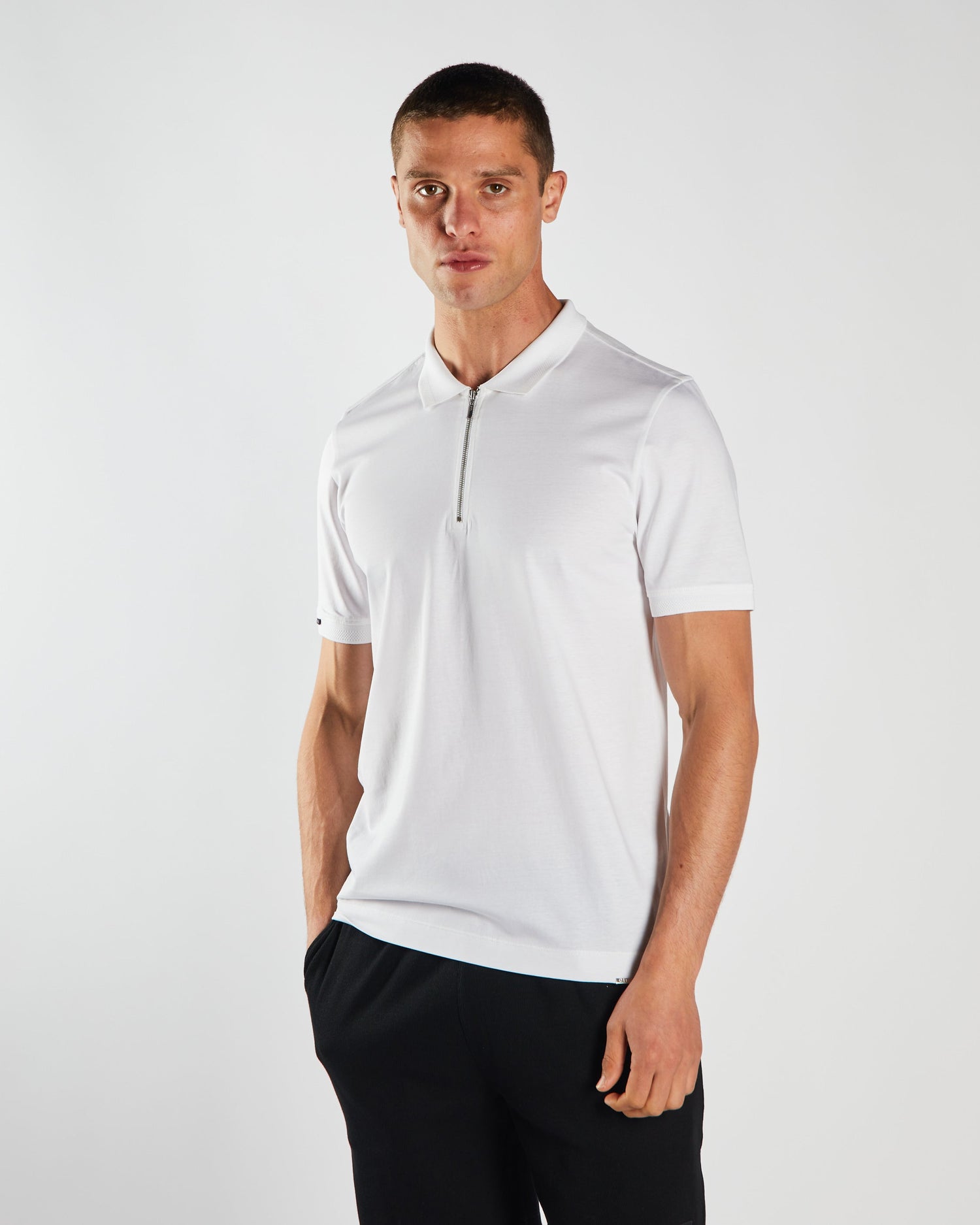 Men's jersey polo with Zip detail, branded woven badge on the sleeve.