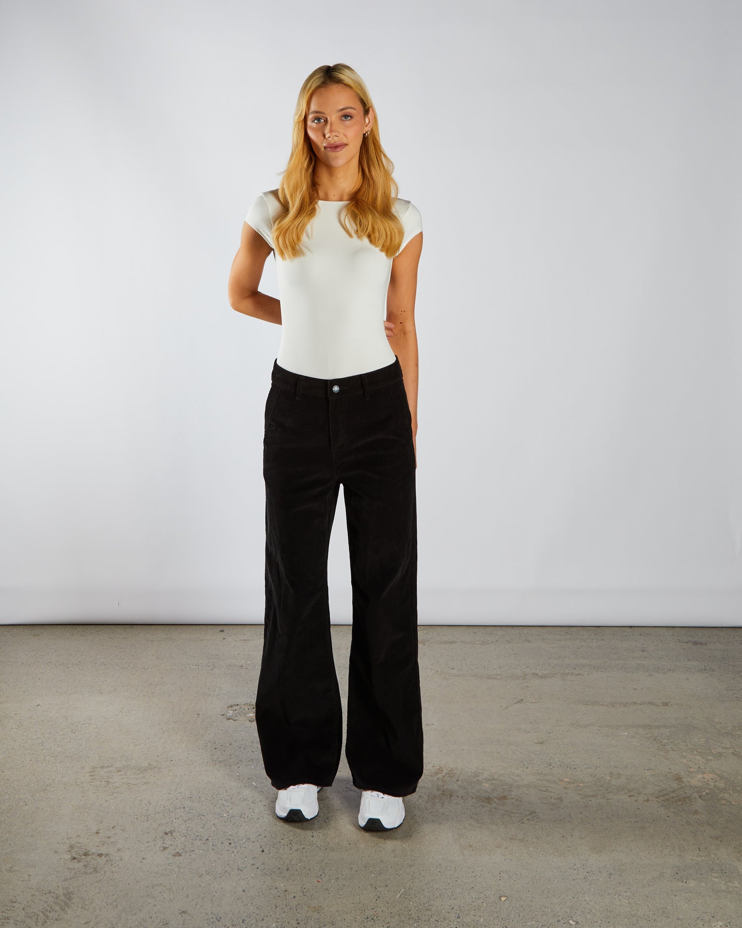 This black baby cord is the prefect winter wide leg alternative to denim. The soft velvet like cord drapes perfectly to create a flattering leg shape. The luxurious fabric and high waist make this trouser super comfortable. It can be dressed up or down.