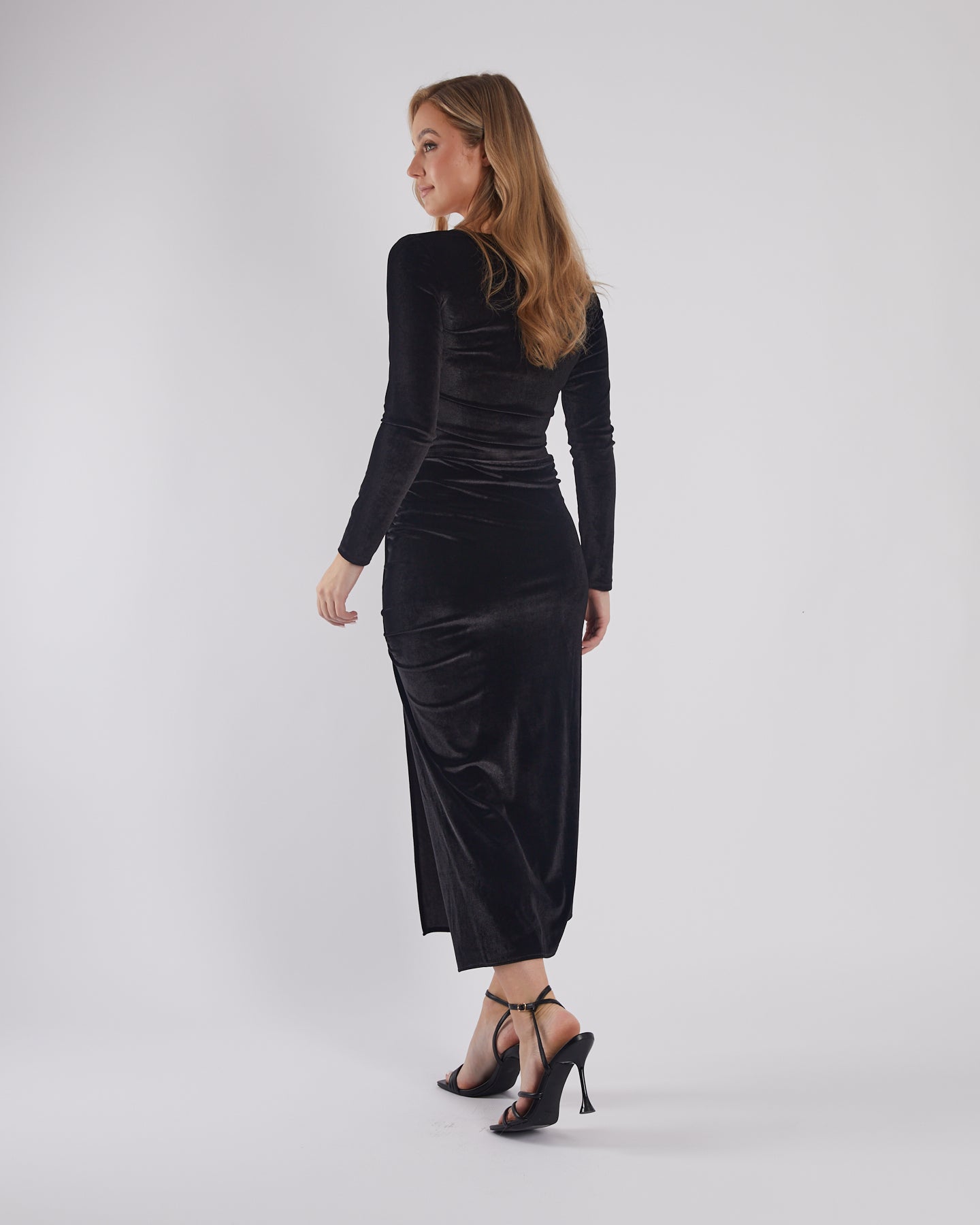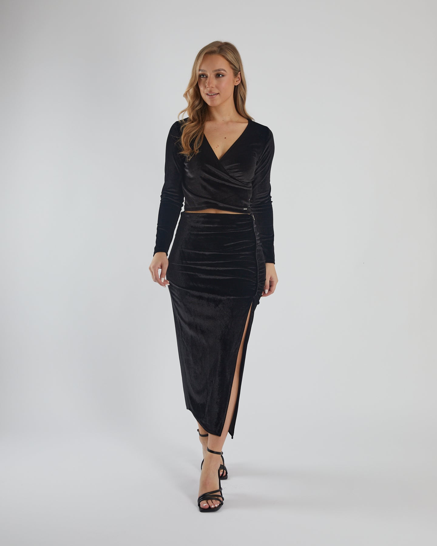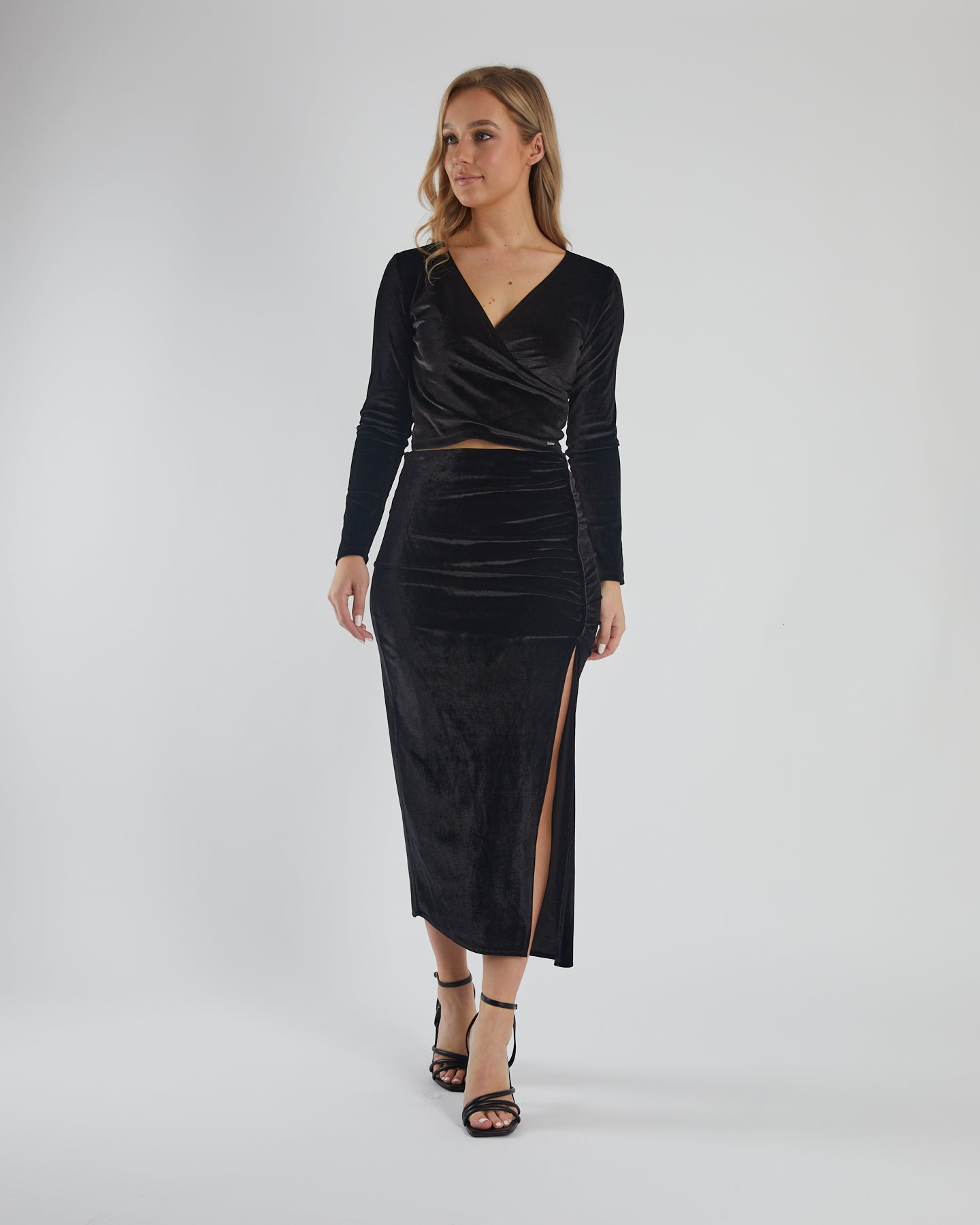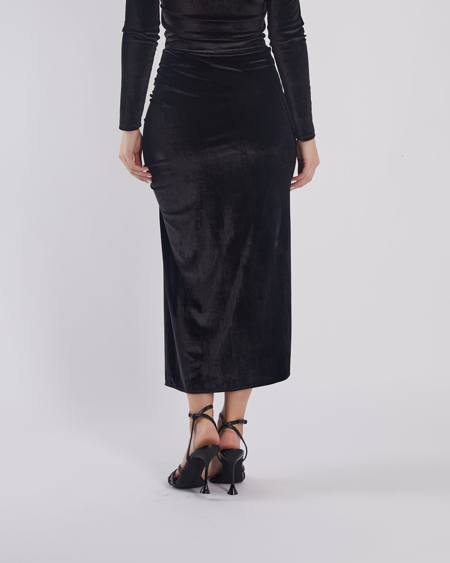 This mid-length velvet skirt is fitted with a ruched seam and tasteful front slit, capped off with a Diesel branded metal badge at the waist. Match with the Moya top in black to complete the full look.