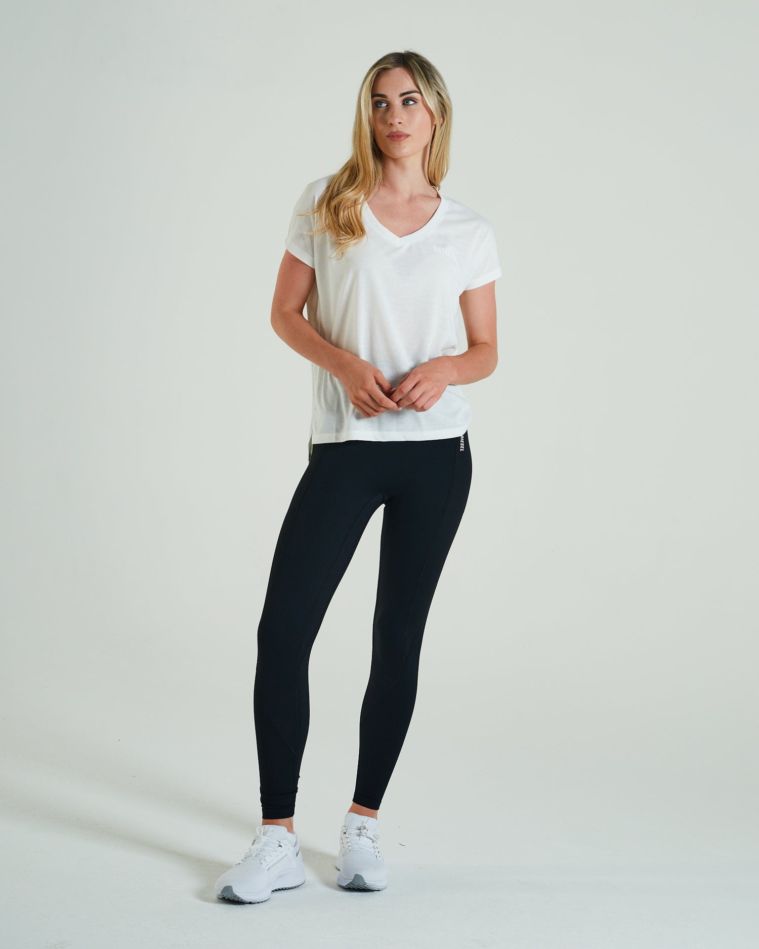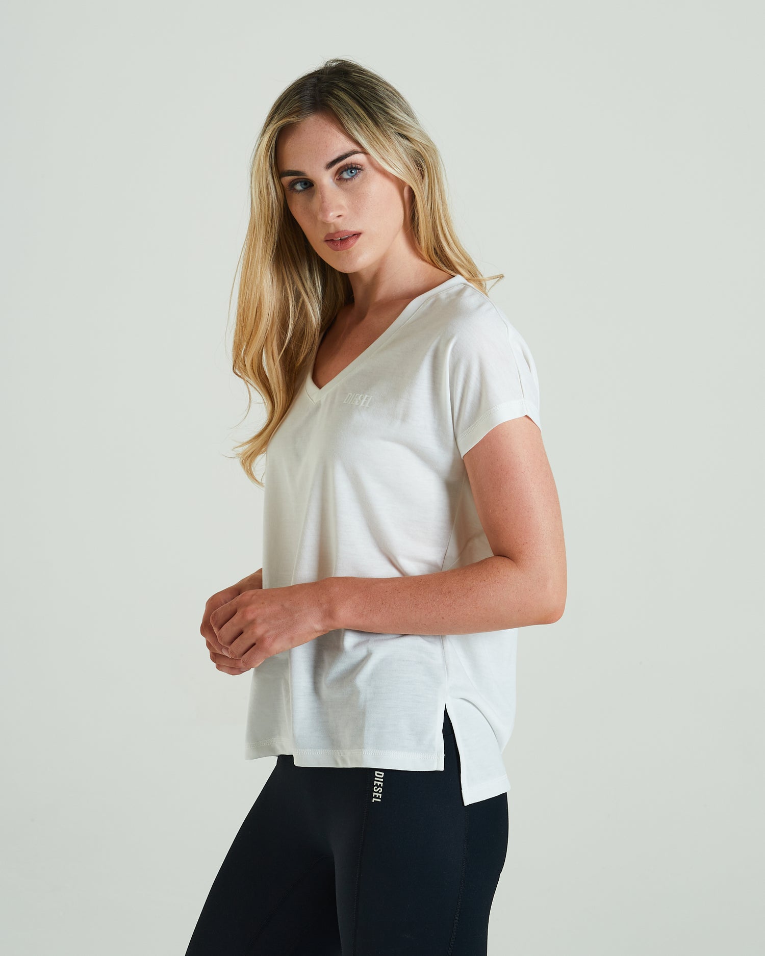 Loose V-neck T-shirt in sweat-wicking fabric with raised rubber chest branding.