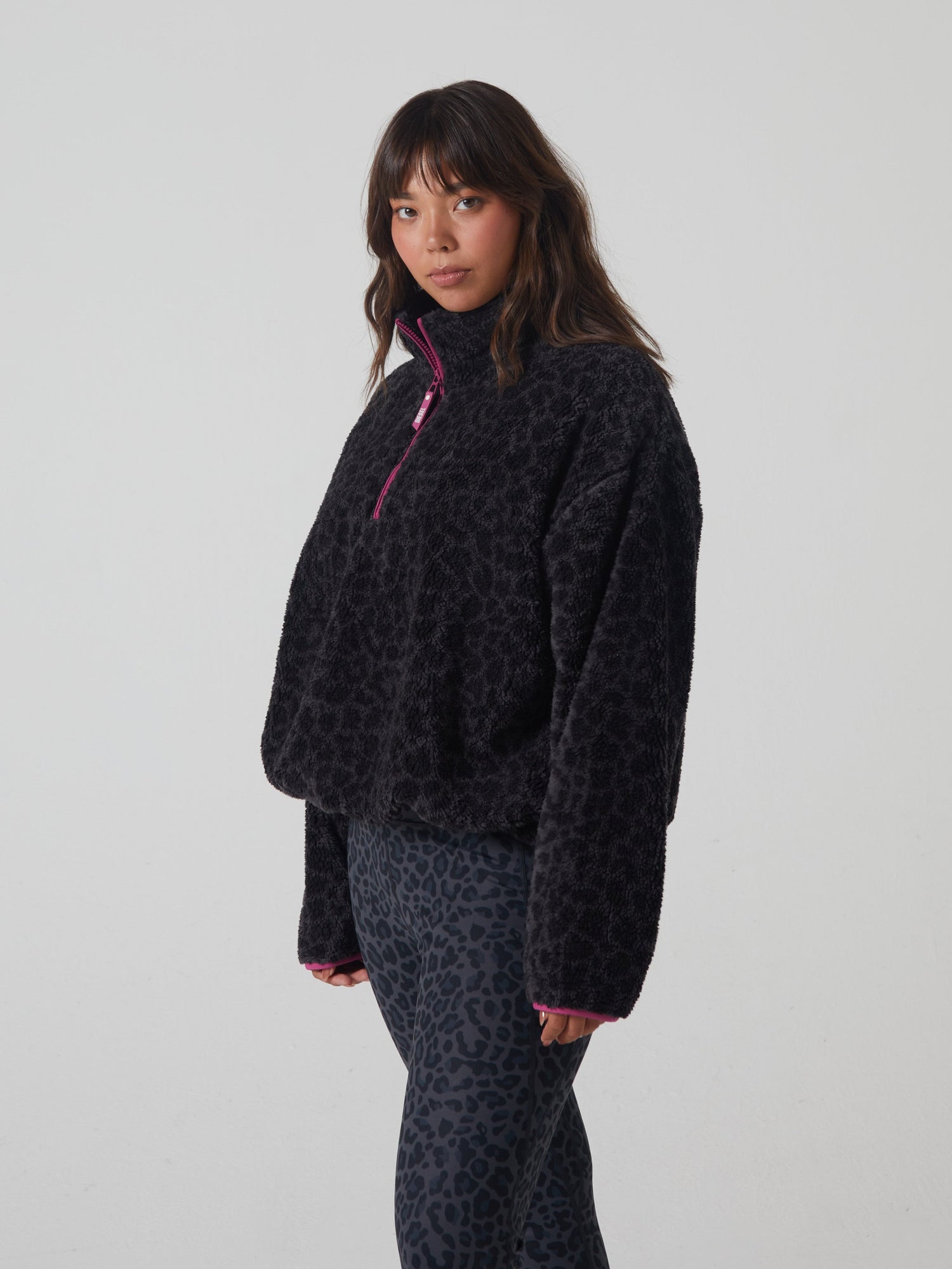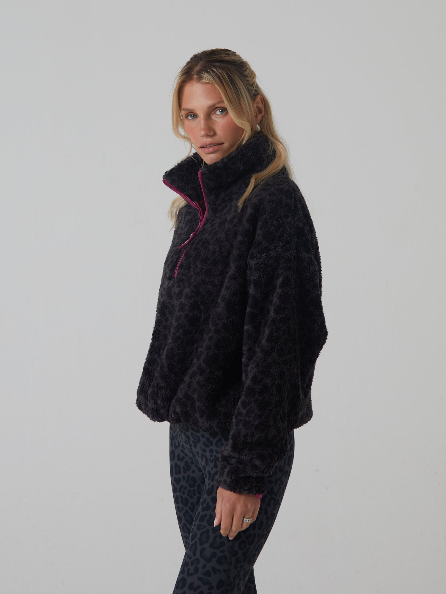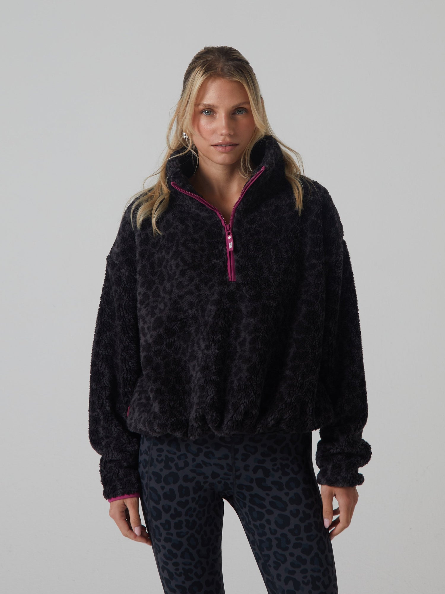 Our Relaxed fit, mid length half zip zipper. Features include super soft teddy fabric and rubber printed Diesel zip puller and inside elastic cord on hem.